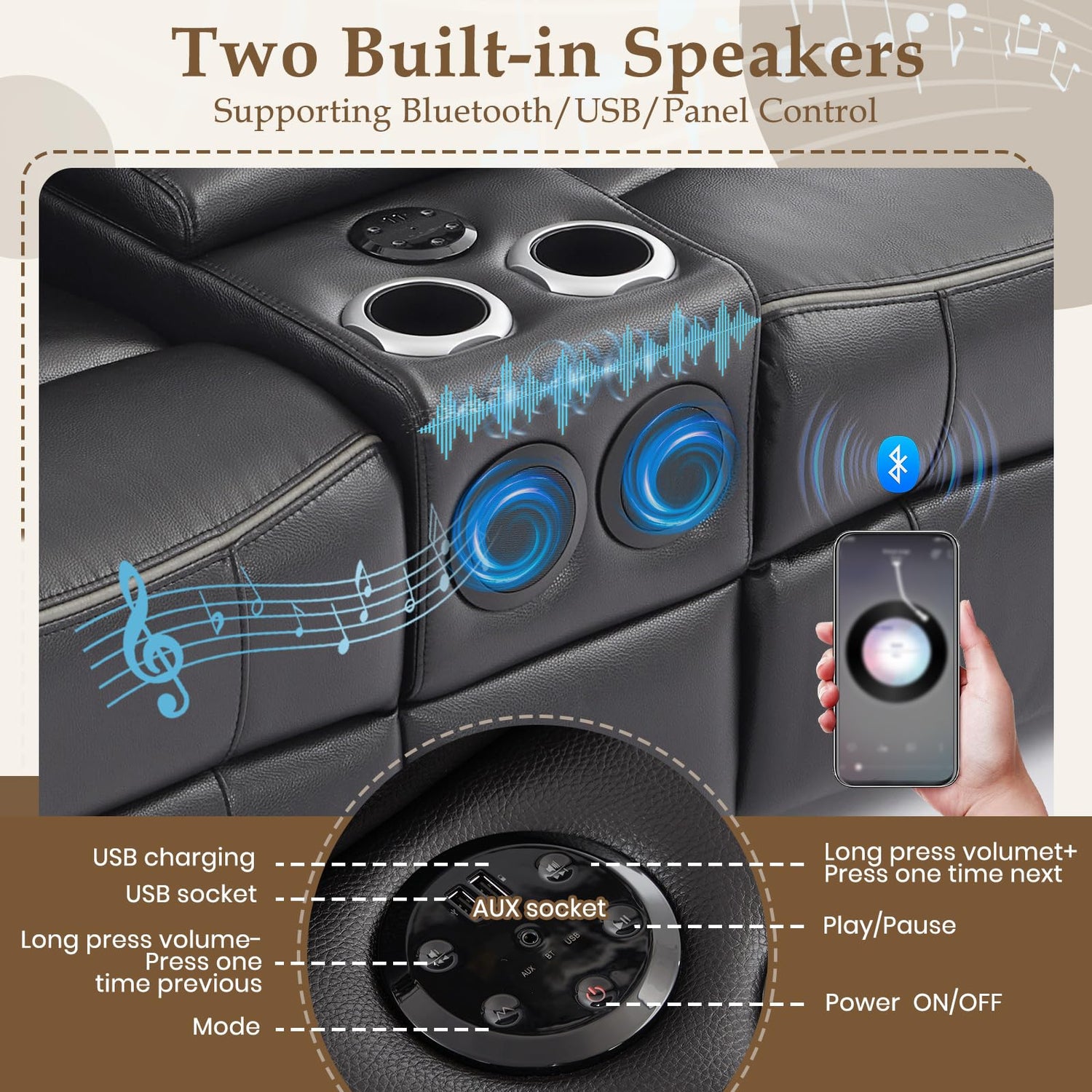 • Dual Channel Intelligent Speaker: This is not just a loveseat, it is your home theater's audio secret weapon. Equipped with dual Bluetooth speakers with 48kHz/24 bit high-resolution audio decoding, the living room is instantly upgraded to a private giant screen cinema with cinema grade 3D surround sound effects. It can seamlessly sync with your phone or USB flash drive and manage playback through an intuitive touch panel - swapping tracks, adjusting volume, or pairing multiple devices in seconds, creating an unparalleled home entertainment center for you