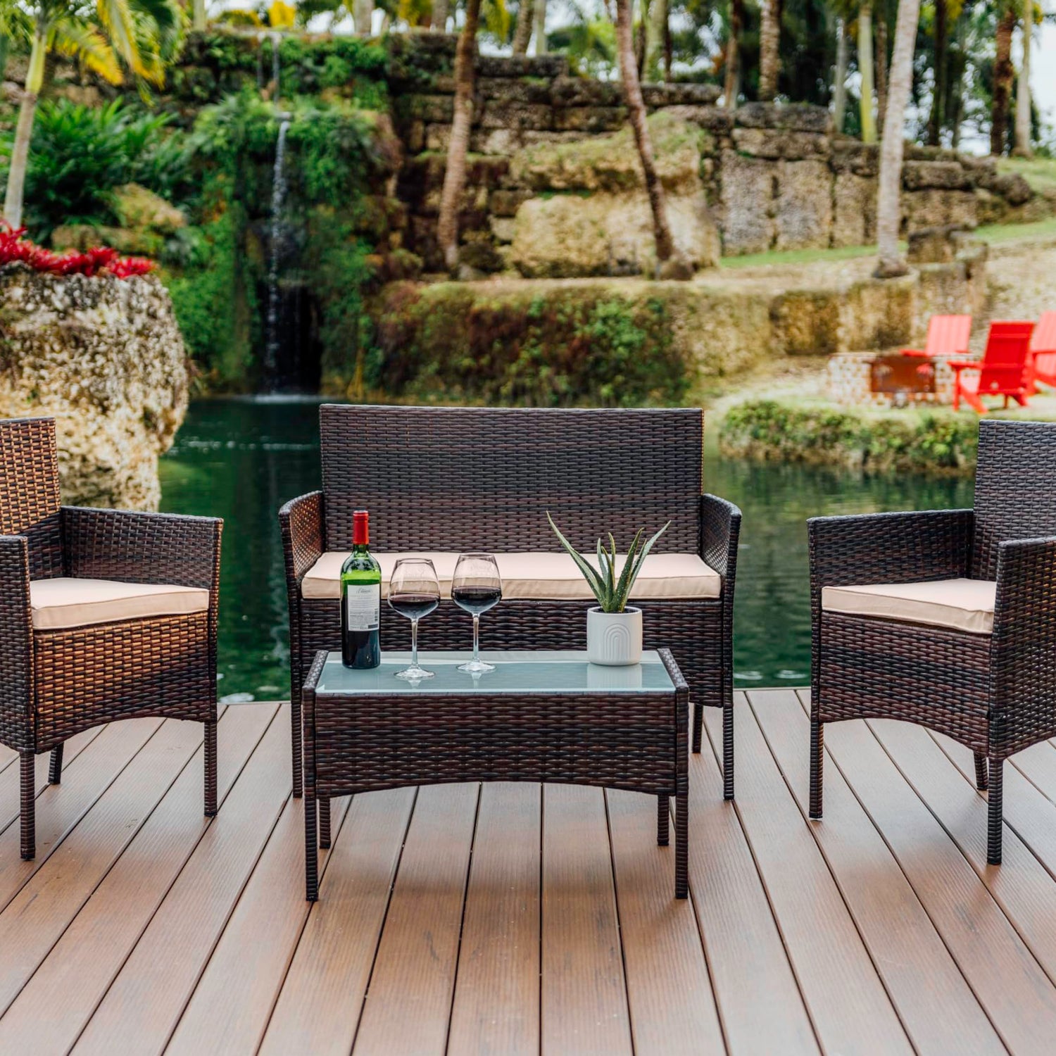 - Wicker Patio Furniture Set: Your outdoor sanctuary awaits with our 4 piece patio furniture set that seats 4 people, complete with patio chairs set of 2, a charming loveseat, and a glass-top coffee table with tinted, tempered glass.