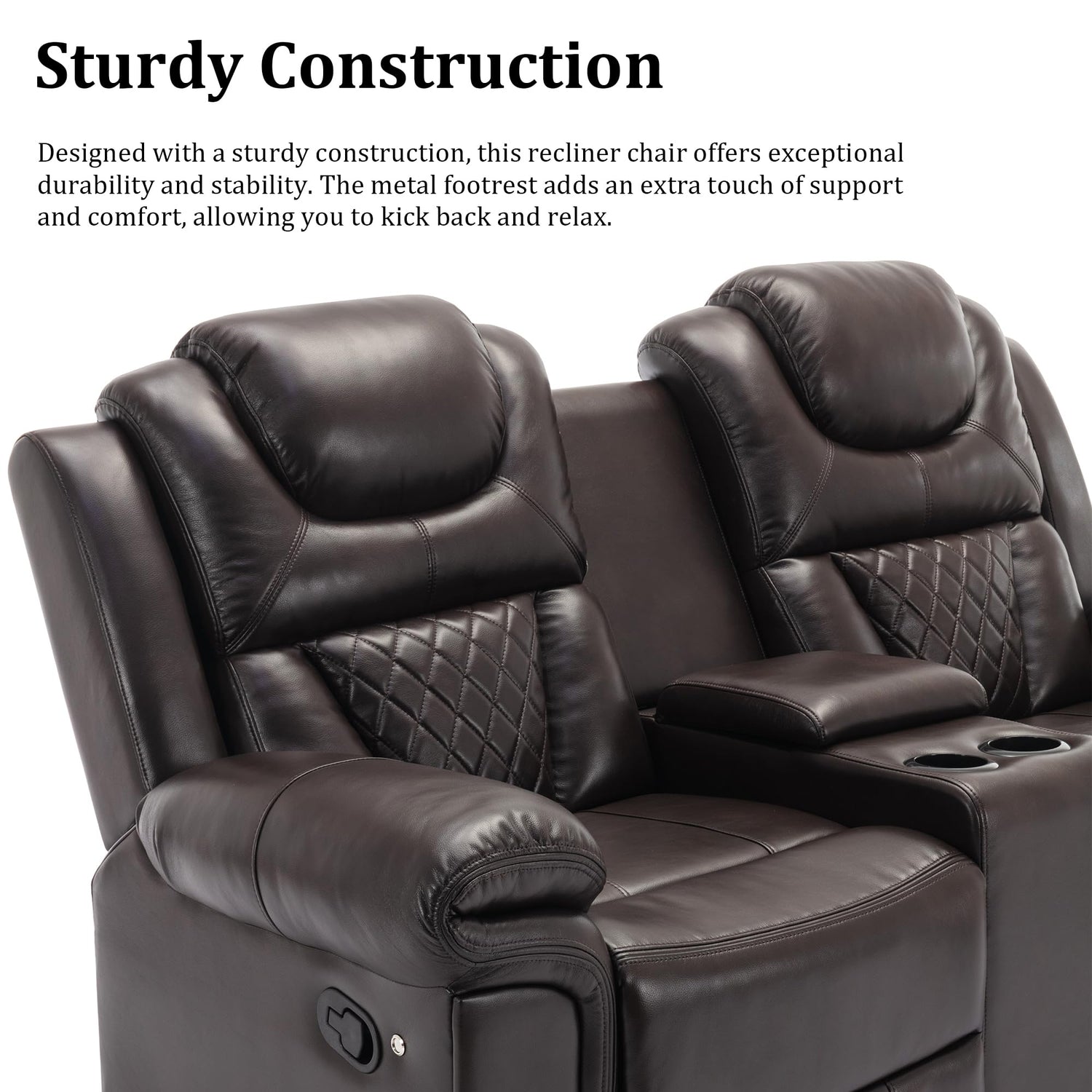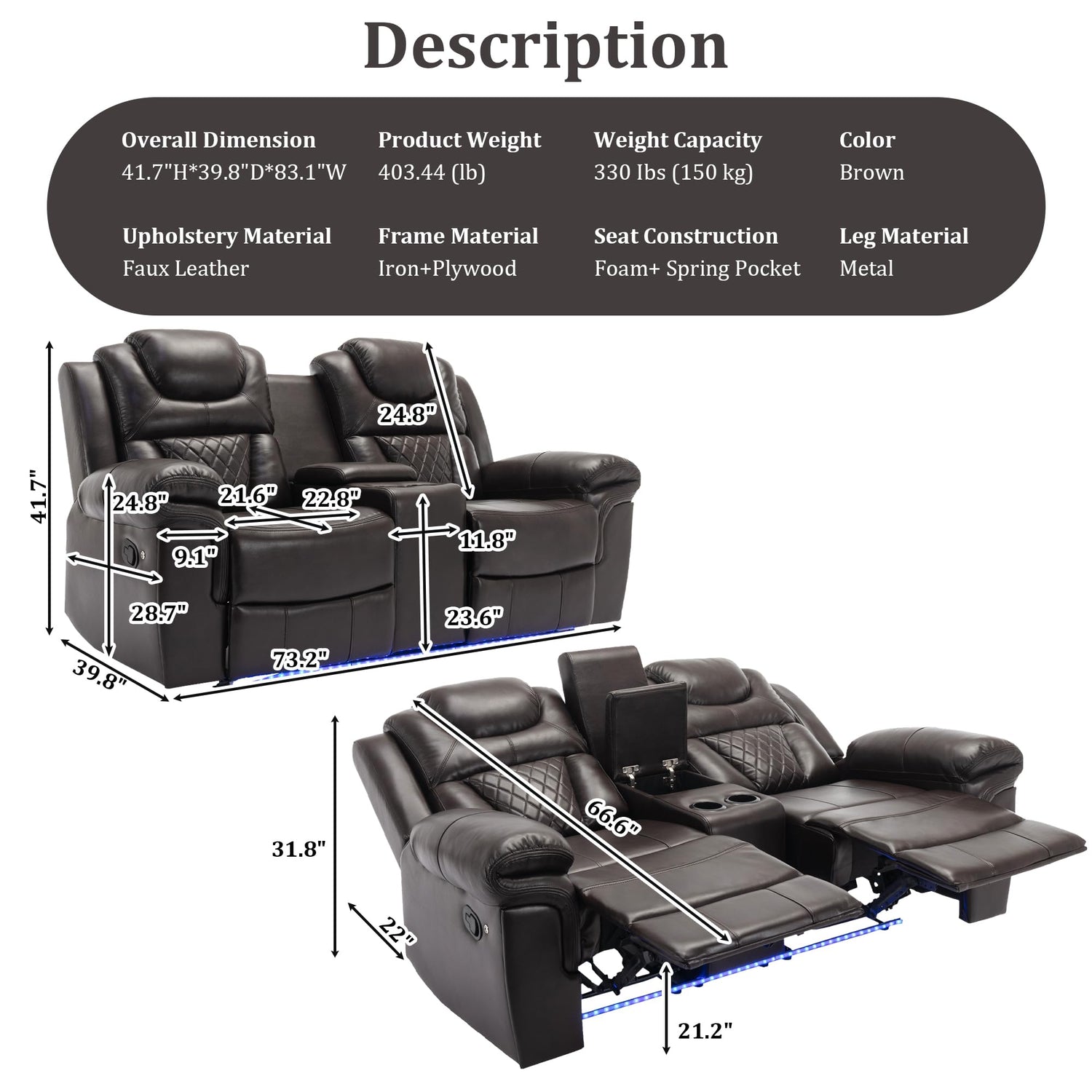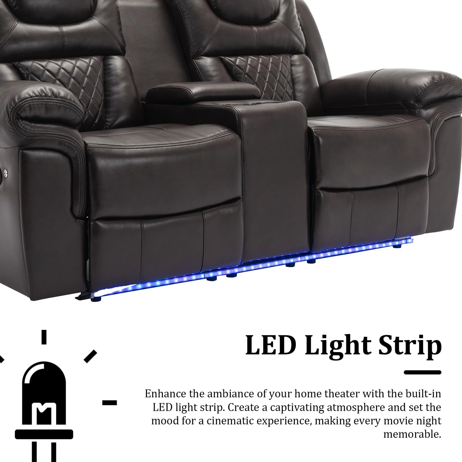 Olodumare Leather Reclining Sofa Set,Home Theater Seating with Center Console, LED Light Strip, and Storage Cup Holders, 2 Seater for Living Room,Office,Home Theater,RV. Loveseat(Brown)