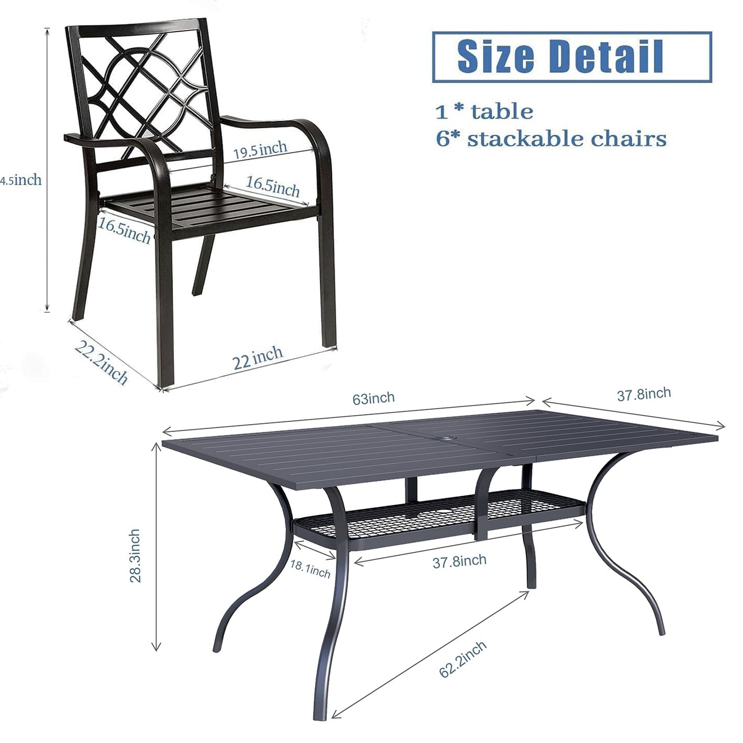 Omelaza 7 Pieces Patio Metal Furniture Outdoor Dining Set with 6 Stackable Bistro Chairs, and 60'' x 37'' Rectangle Table with Umbrella Hole (Black)