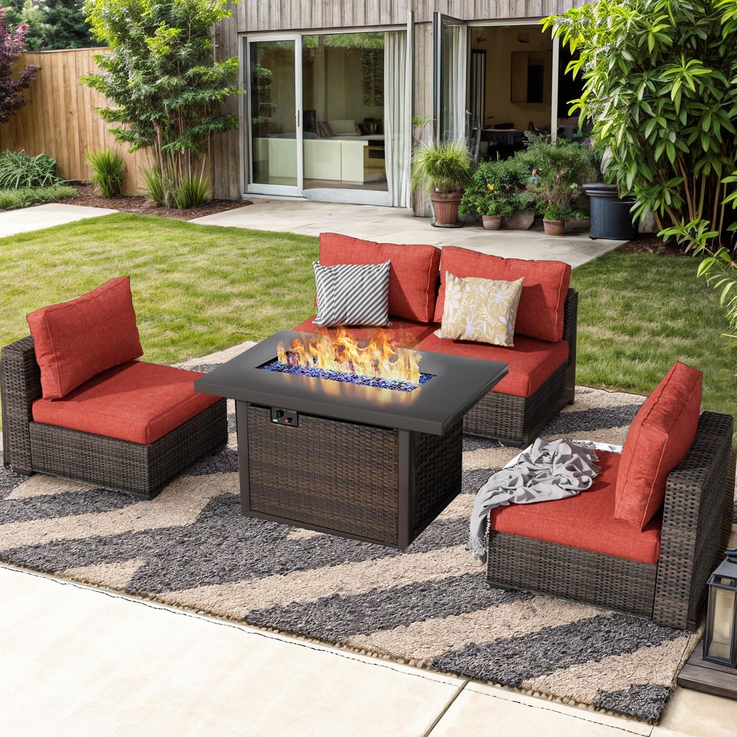 Outdoor Sectional Furniture, 5 Piece Patio Furniture Set with 42-inch Fire Wicker Propane Fire Pit Table - All Weather Wicker Rattan Couch Sofa Conversation Set for Backyard Lawn Poolside Deck, Red