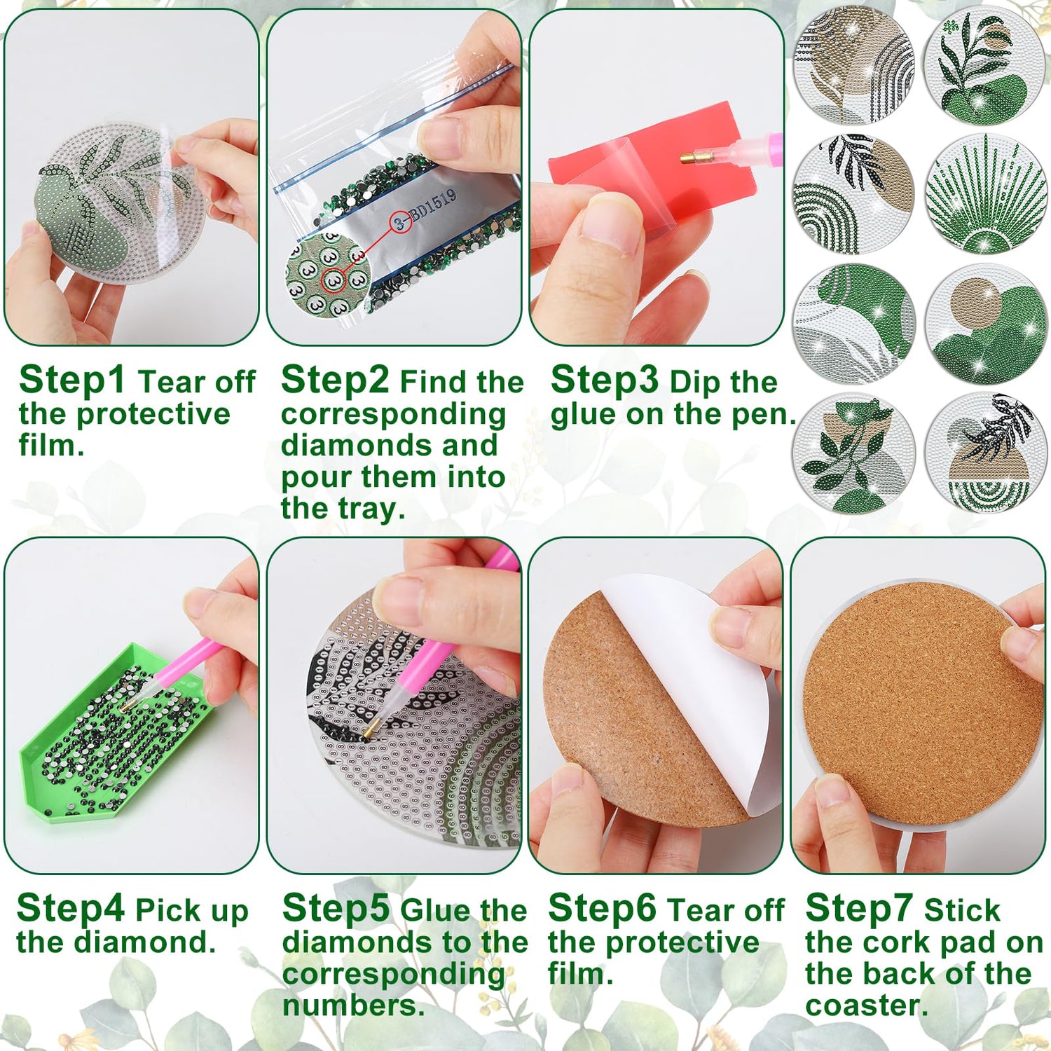 - Package Content: You will receive 8 x diamond art painting coaster, 8 x cork pad, 1 set colorful diamonds, 1 x diamond art painting pen, 1 x diamond tray, 1 x clay glue, 1 x cup holder