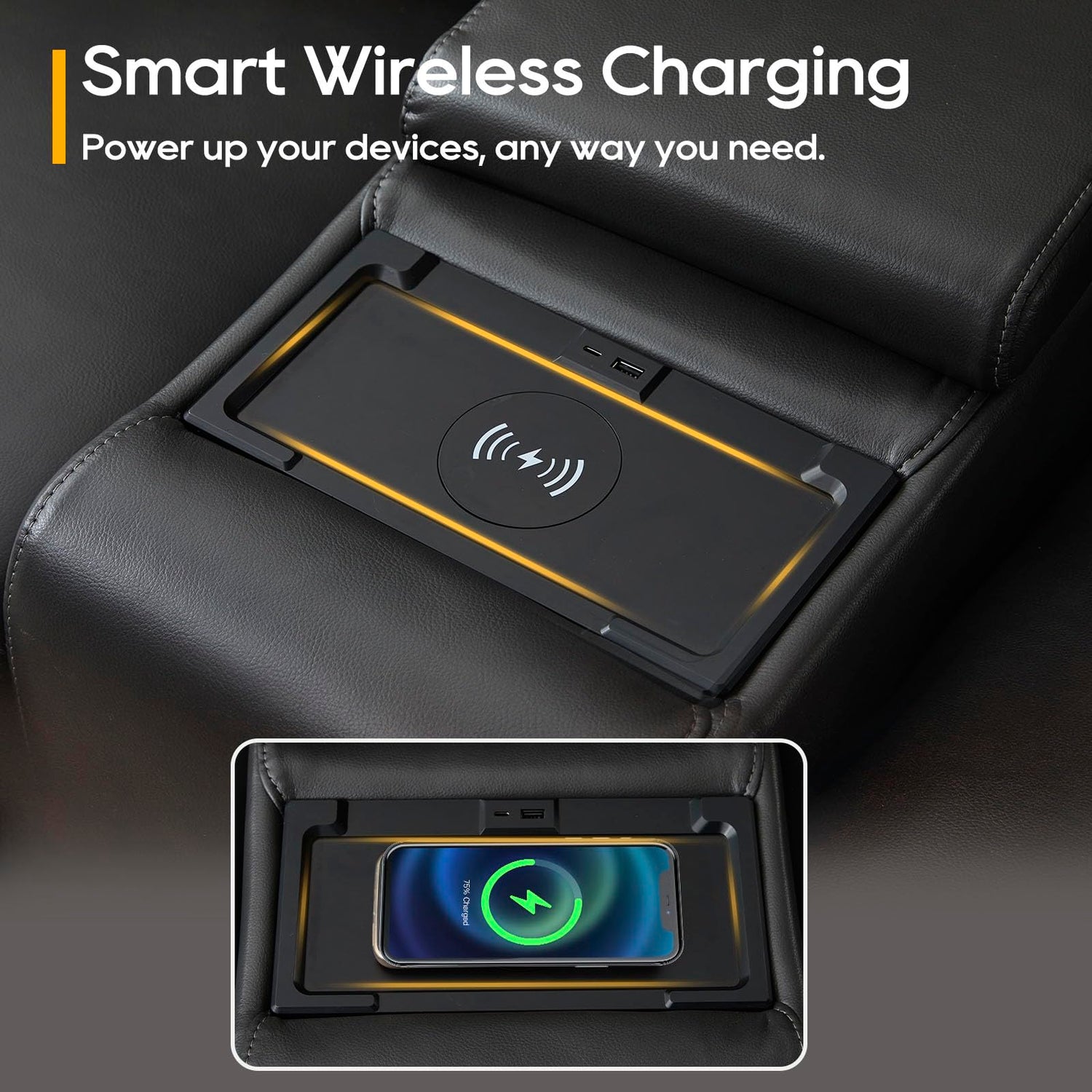- Multifunctional Center Console - Features wireless charging with nano-level smart coils for instant "drop-and-charge" ease. The flat top surface provides a stable area for placing snacks, books or phones, while the flip-up compartment door reveals a spacious storage space for blankets, throws or glasses. Extra USB and Type-C ports keep all your devices powered.