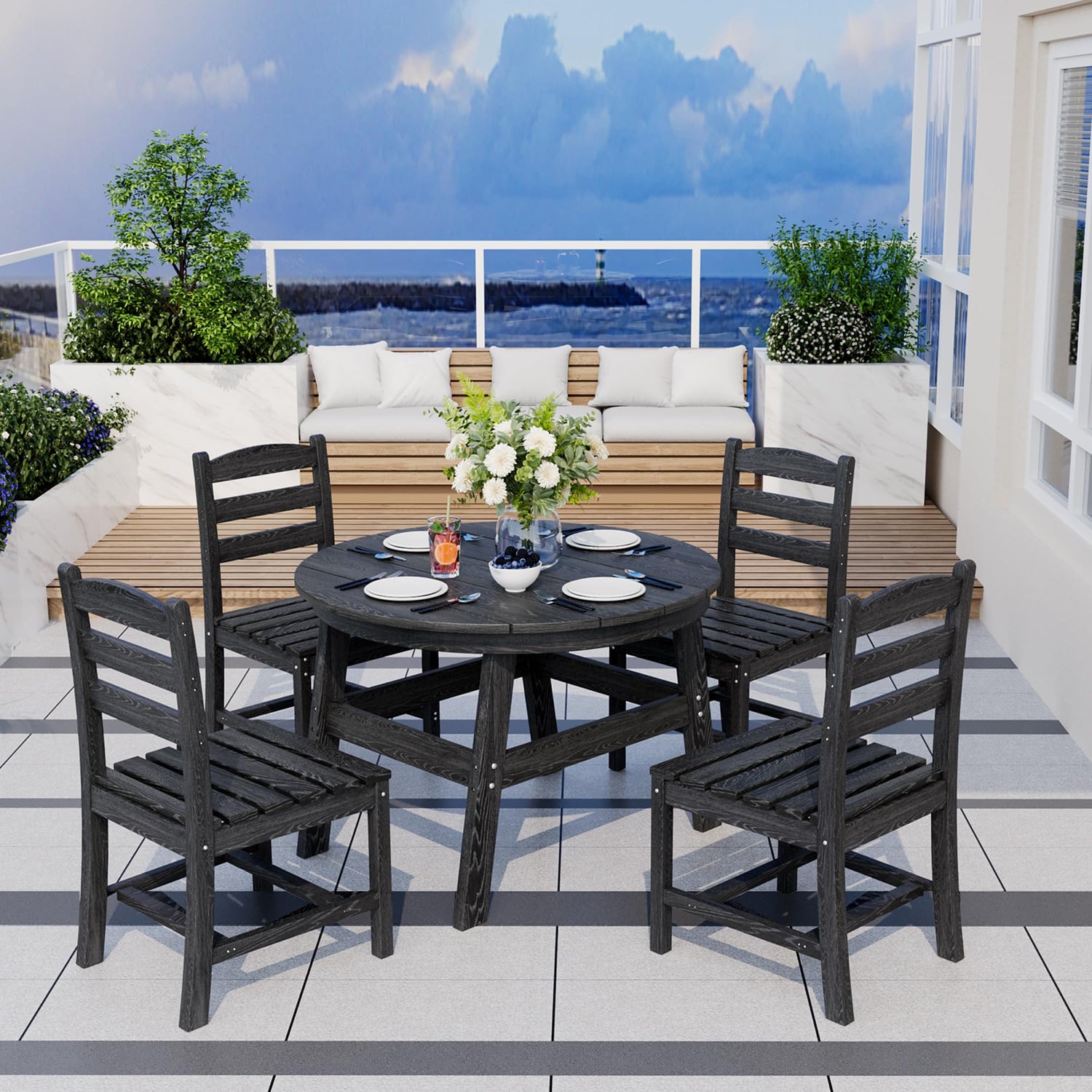 PamapicLife 5 Piece Round Outdoor Dining Set, Relaxing HDPE Outdoor Table and Chairs with 105° Ergonomic Backrest, All-Weather Patio Table and Chairs Set with Umbrella Hole for Porch, Poolside, Black