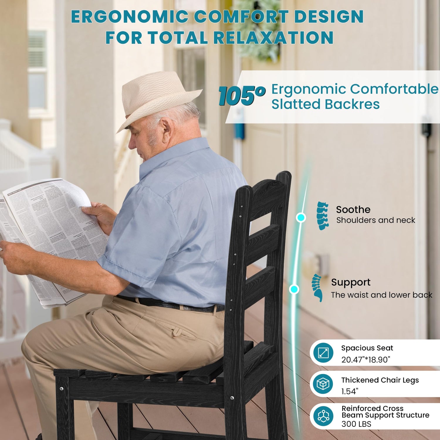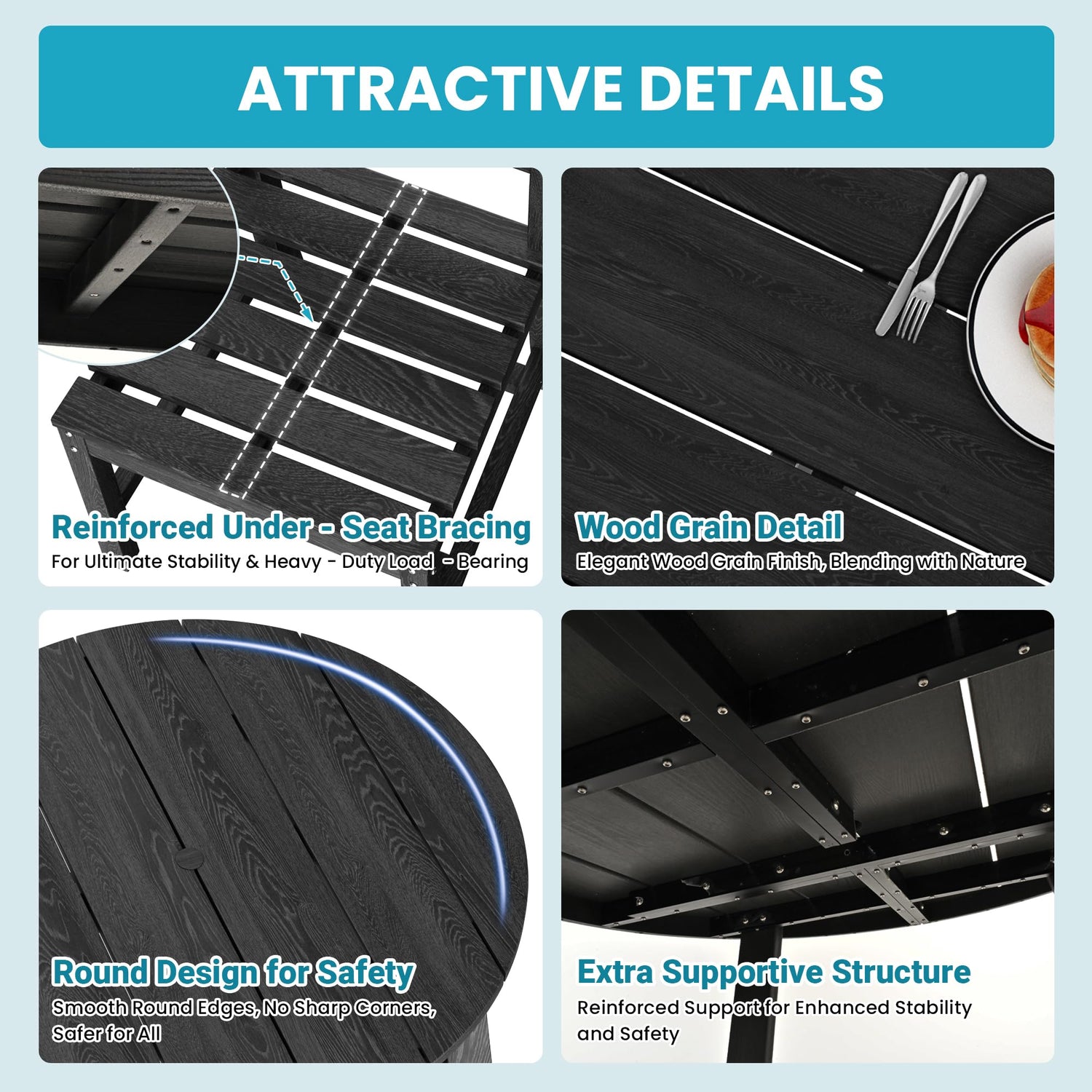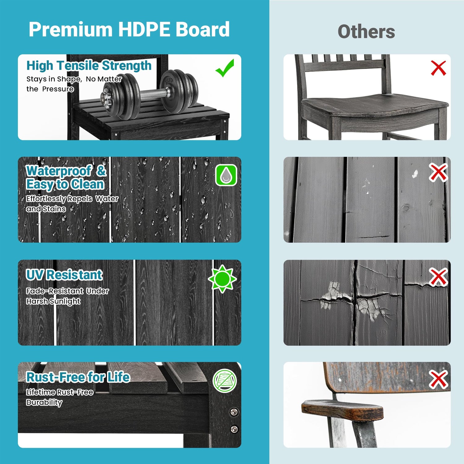 - Durable HDPE for All-Weather Outdoor Use: Constructed from premium HDPE, this patio dining set boasts exceptional tensile strength for heavy loads, a waterproof surface that repels stains, and UV-stabilized material to resist fading. With rust-free components for lifelong durability, it’s built for year-round outdoor use—no weather damage, no hassle.