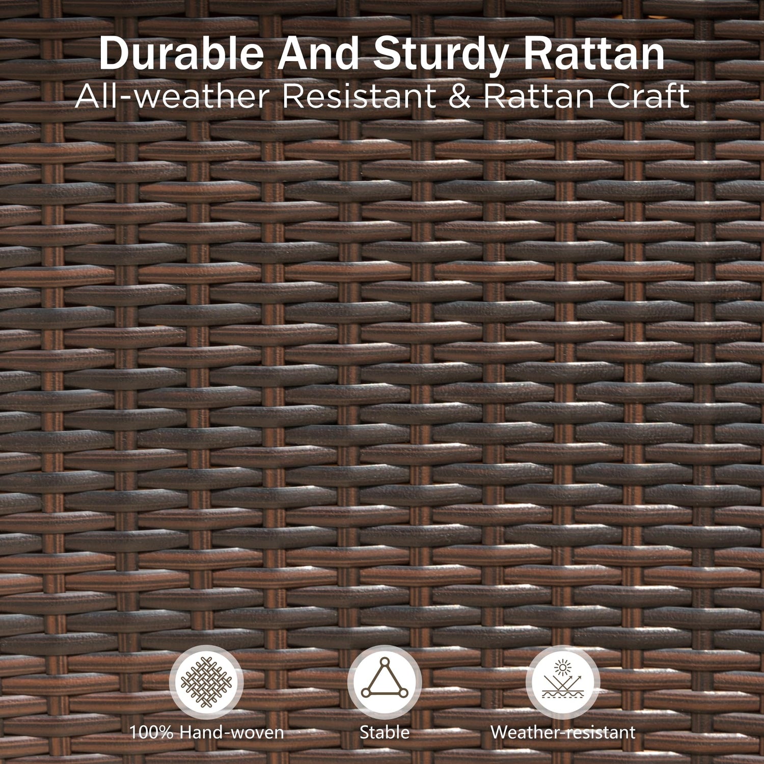 - Cushioned Rattan Chairs: Chairs are made of tightly woven weatherresistant wicker material, UV & fade resistant. Chair legs use high density steel tube, which is strong and lightweight. With removable cushion for comfortable sitting. Dimension: 23.8L x 19.7W x 34.4H.