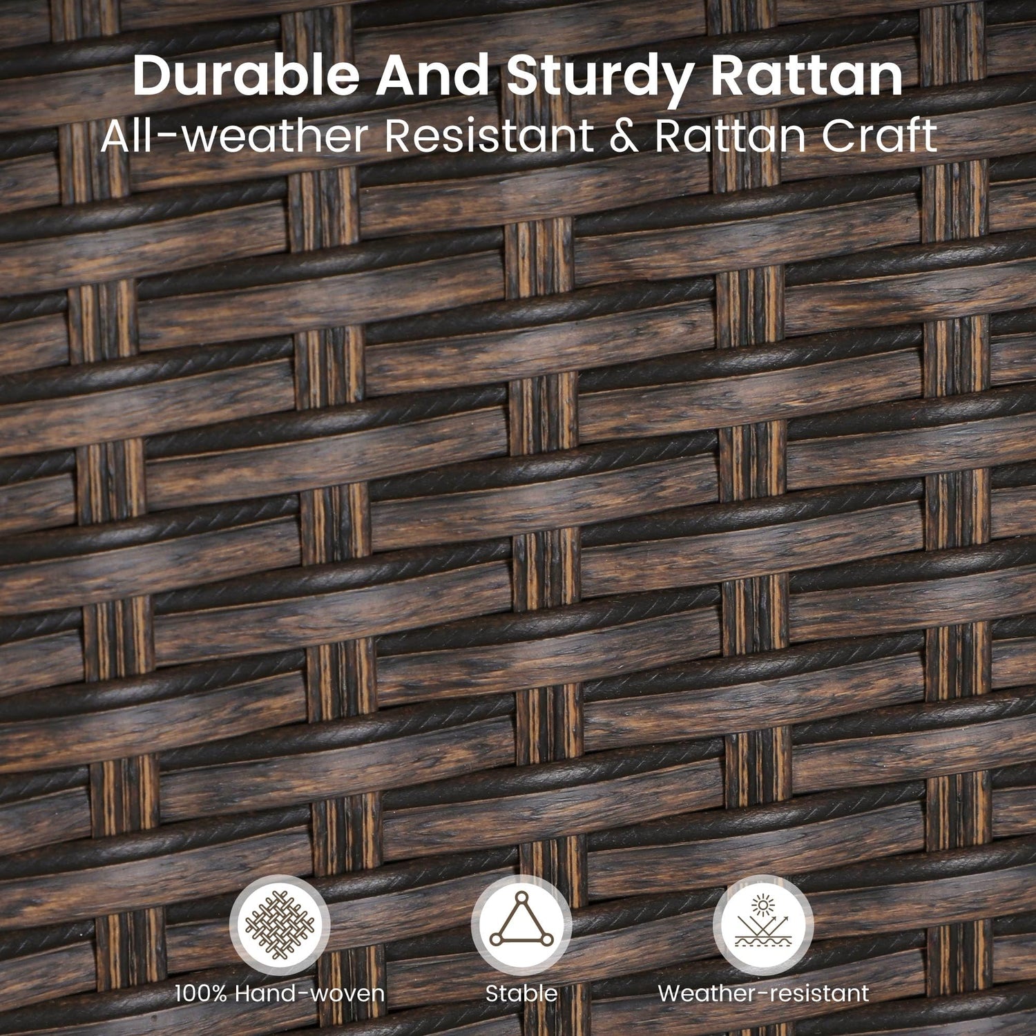 - Cushioned Rattan Chairs: Chairs are made of tightly woven weatherresistant wicker material, UV & fade resistant. Chair legs use high density steel tube, which is strong and lightweight. With removable cushion for comfortable sitting. Dimension: 23.8L x 19.7W x 34.4H.