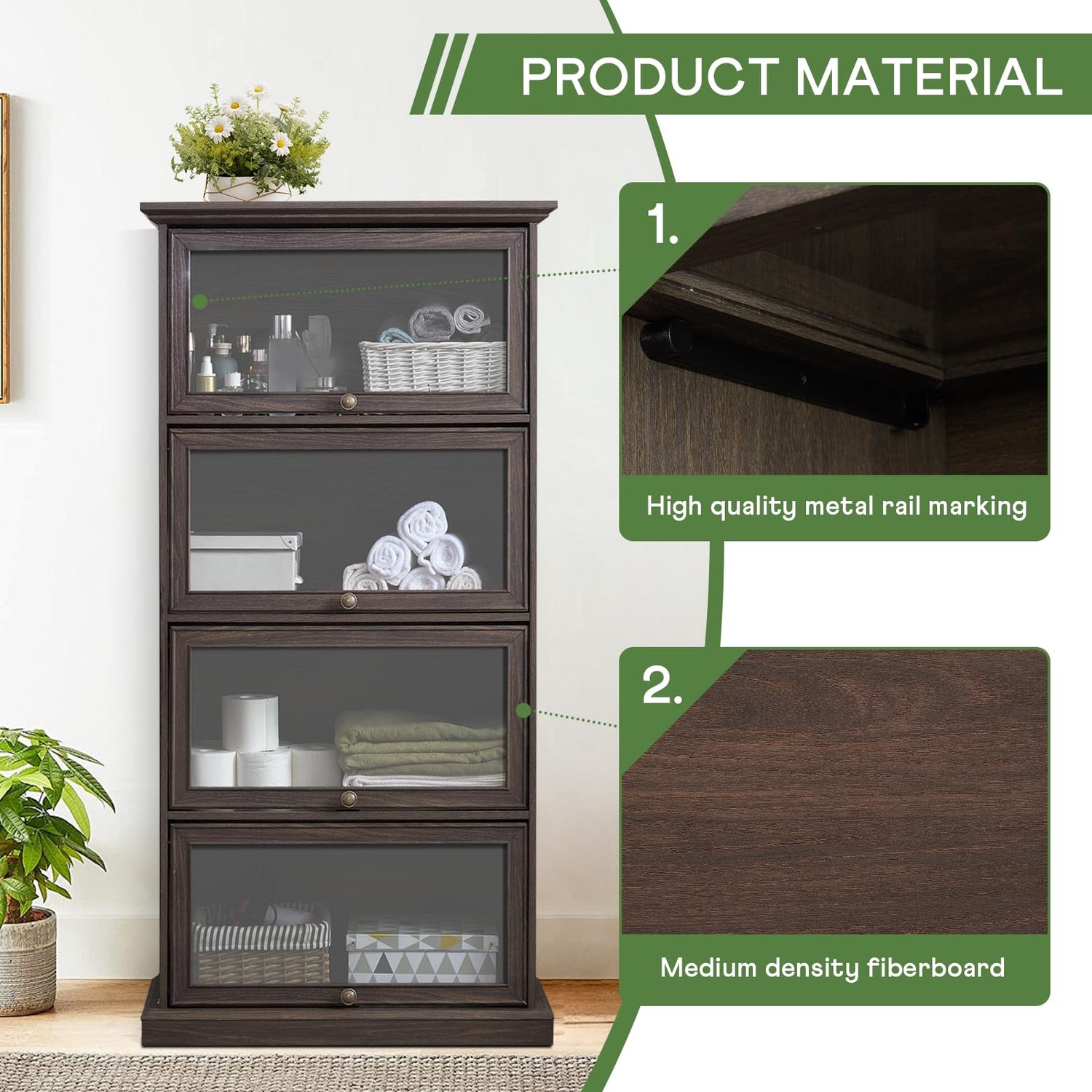 - Storage Space: This book shelf with flip up glass doors features 4 tier storage space. The curio cabinet can be used to store or display your books,file, doucument, curio, photos, collections, decorative crafts, toys