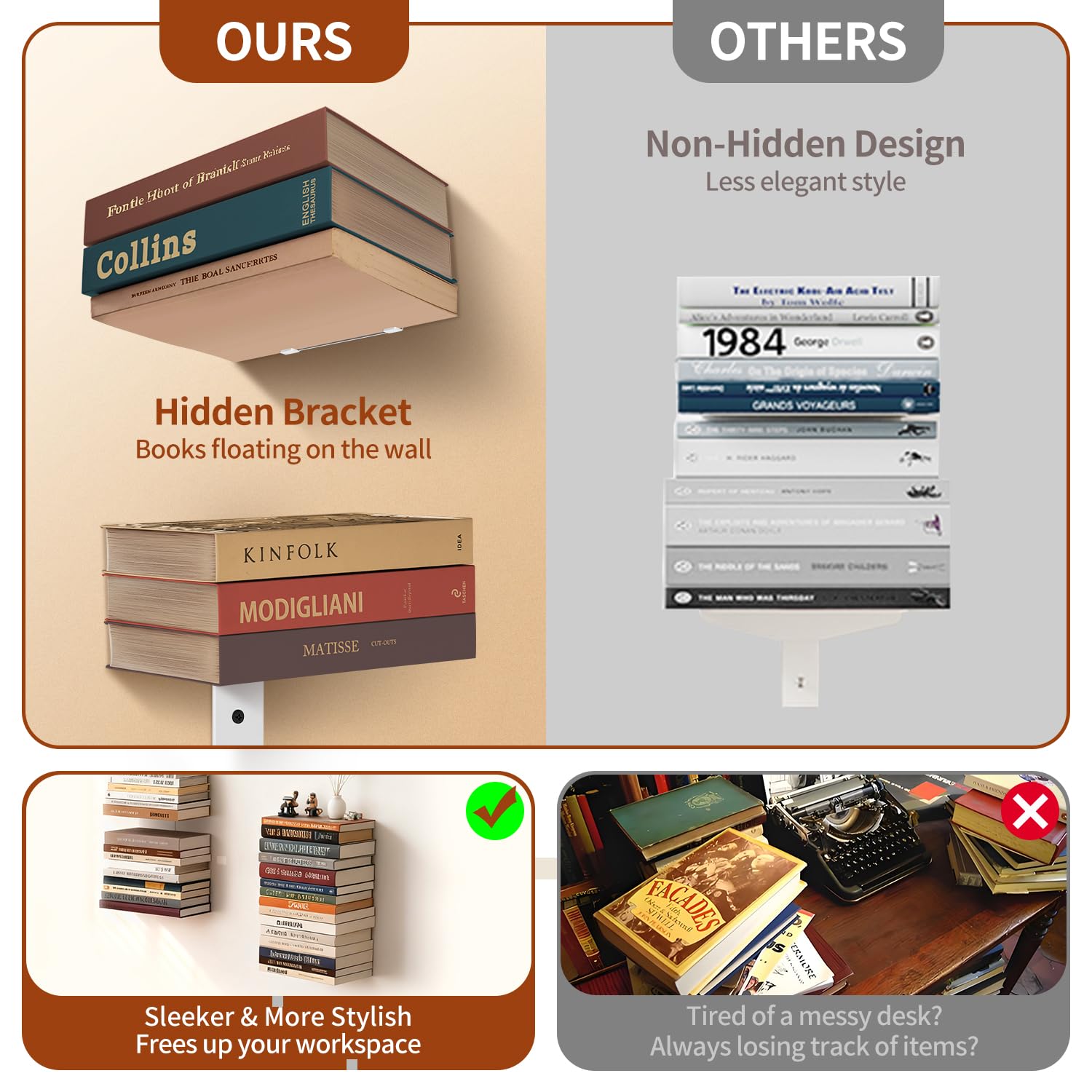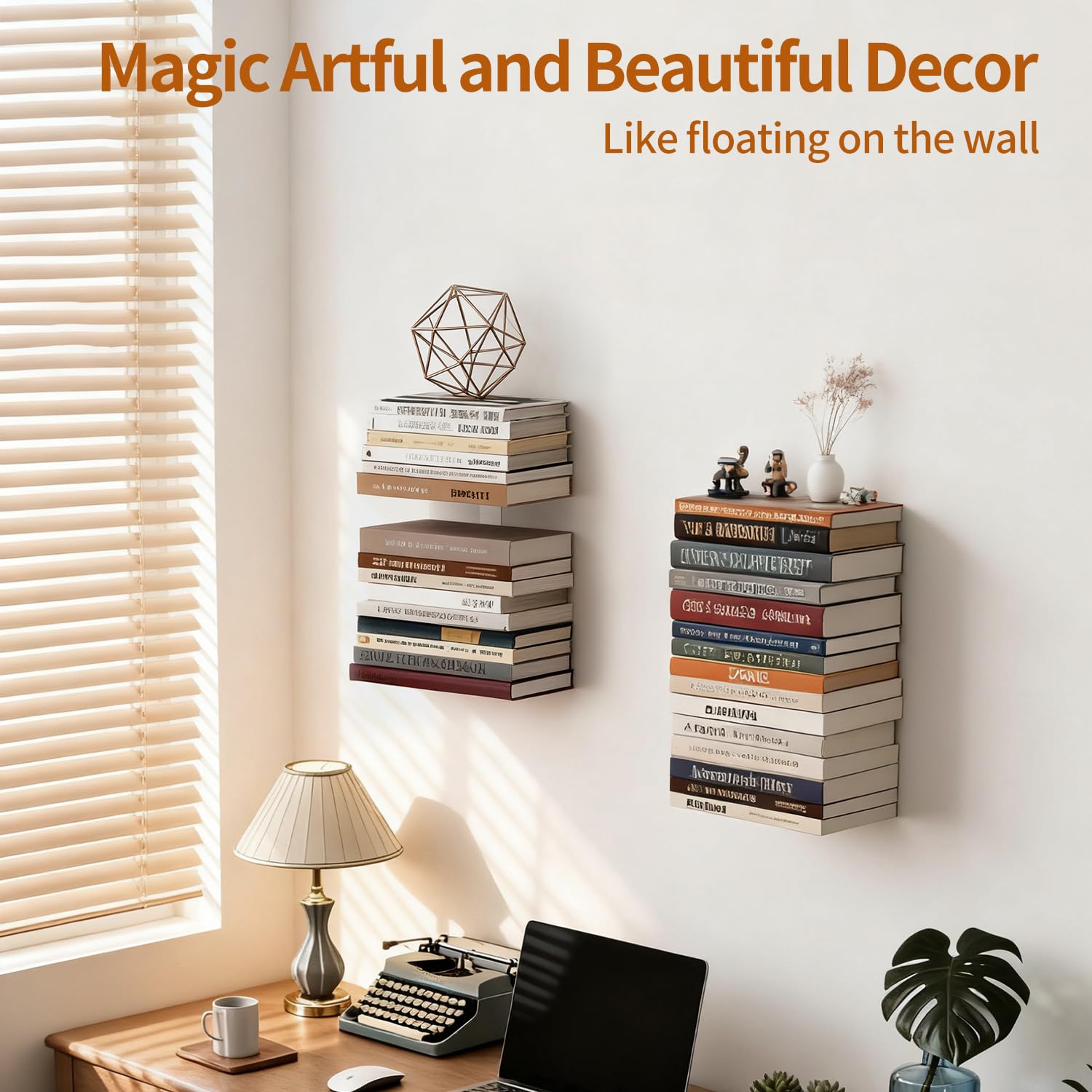 - Innovative Design and Artful Decor - Our invisible floating bookshelves will transform the way you display and store your favorite books. Different from other traditional giant bookshelves, you just stack your books onto the sturdy metal shelf, and then stuck the back cover of the bottom book into the M-shaped groove, the shelf will become hidden behind the books, which make your books look like floating on the wall. Turn collections into magic artful decor - functional, fun, and beautiful