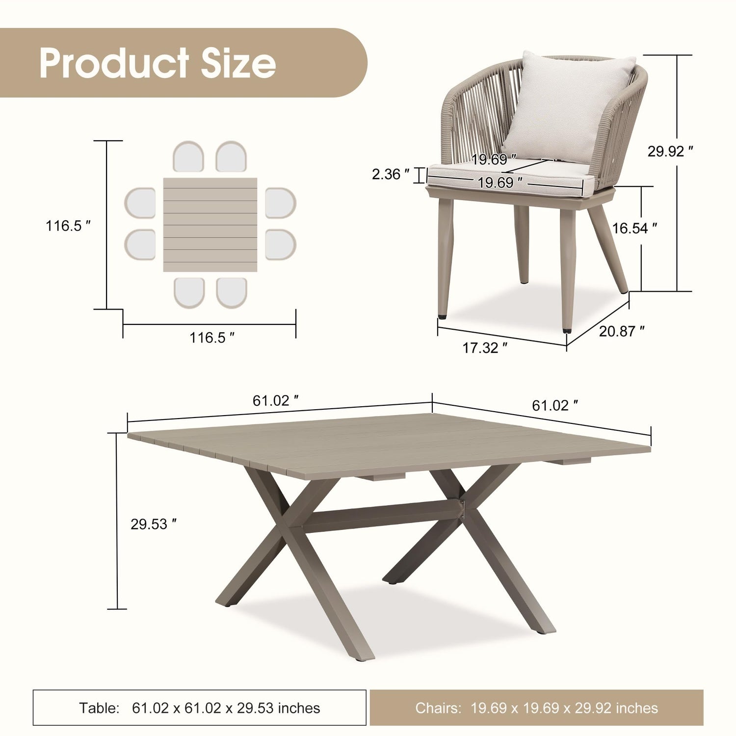 • All-weather champagne dining table set: Includes 1 square table (61.02"L x 61.02"W x 29.53"H) , 8 chairs (19.69"W x 19.69"D x 29.92"H, 16.54"SH ) with 8 seat cushions and 8 back pillows.