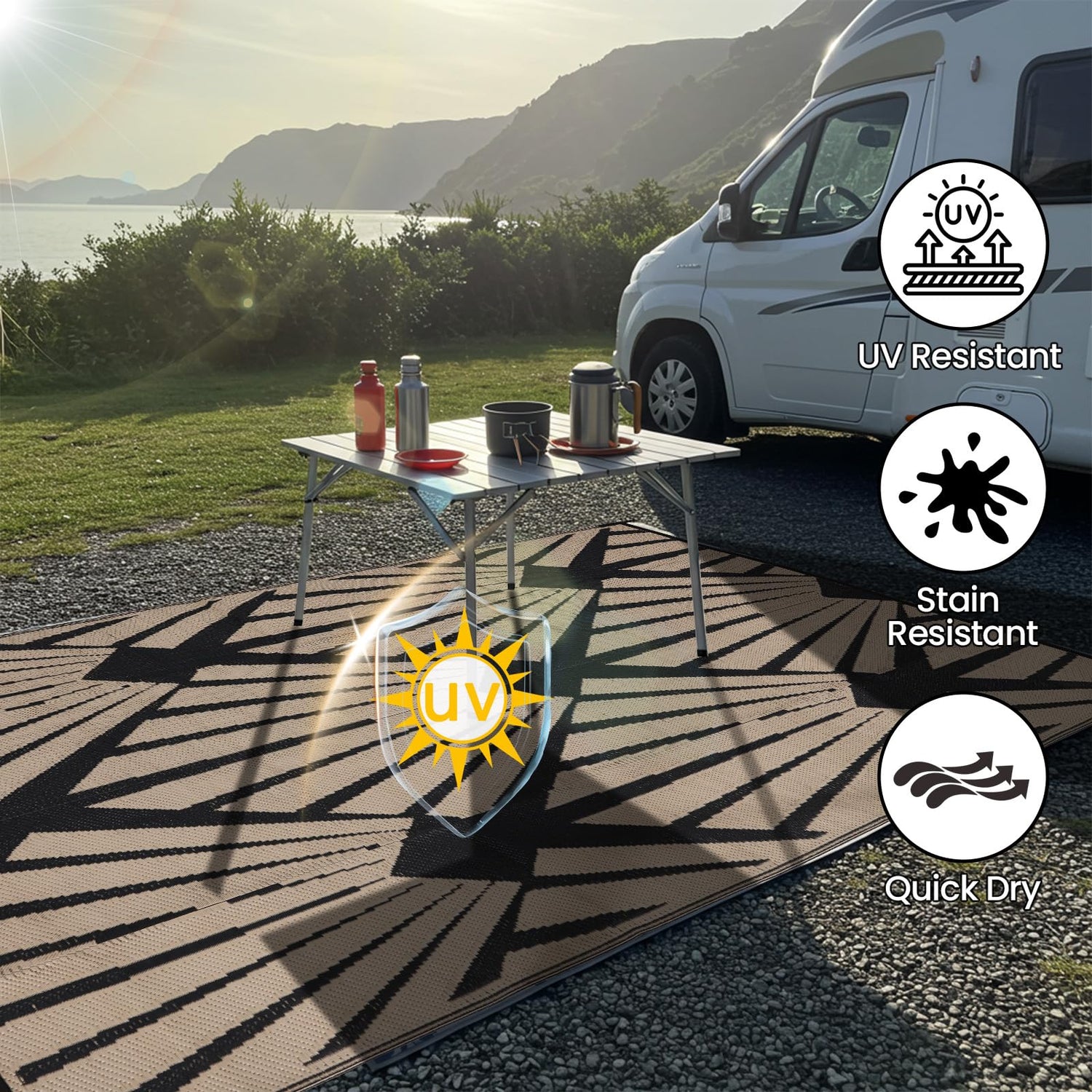 • ใ€๐—ฅ๐—ฒ๐˜ƒ๐—ฒ๐—ฟ๐˜€๐—ถ๐—ฏ๐—น๐—ฒ ๐—š๐—ฒ๐—ผ๐—บ๐—ฒ๐˜๐—ฟ๐—ถ๐—ฐ ๐—–๐—ฎ๐—บ๐—ฝ๐—ถ๐—ป๐—ด ๐—ฅ๐˜‚๐—ด โ€“ ๐—ฆ๐˜๐˜†๐—น๐—ฒ ๐— ๐—ฒ๐—ฒ๐˜๐˜€ ๐—™๐˜‚๐—ป๐—ฐ๐˜๐—ถ๐—ผ๐—ปใ€‘ Made from UV-resistant polypropylene, this versatile outdoor rug features a modern geometric design on both sides. Flip to the dark side to hide stains at campsites or tailgates, or switch to the light side for a clean, stylish look on patios or decksโ€”ideal for RV trips, picnics, and outdoor gatherings.