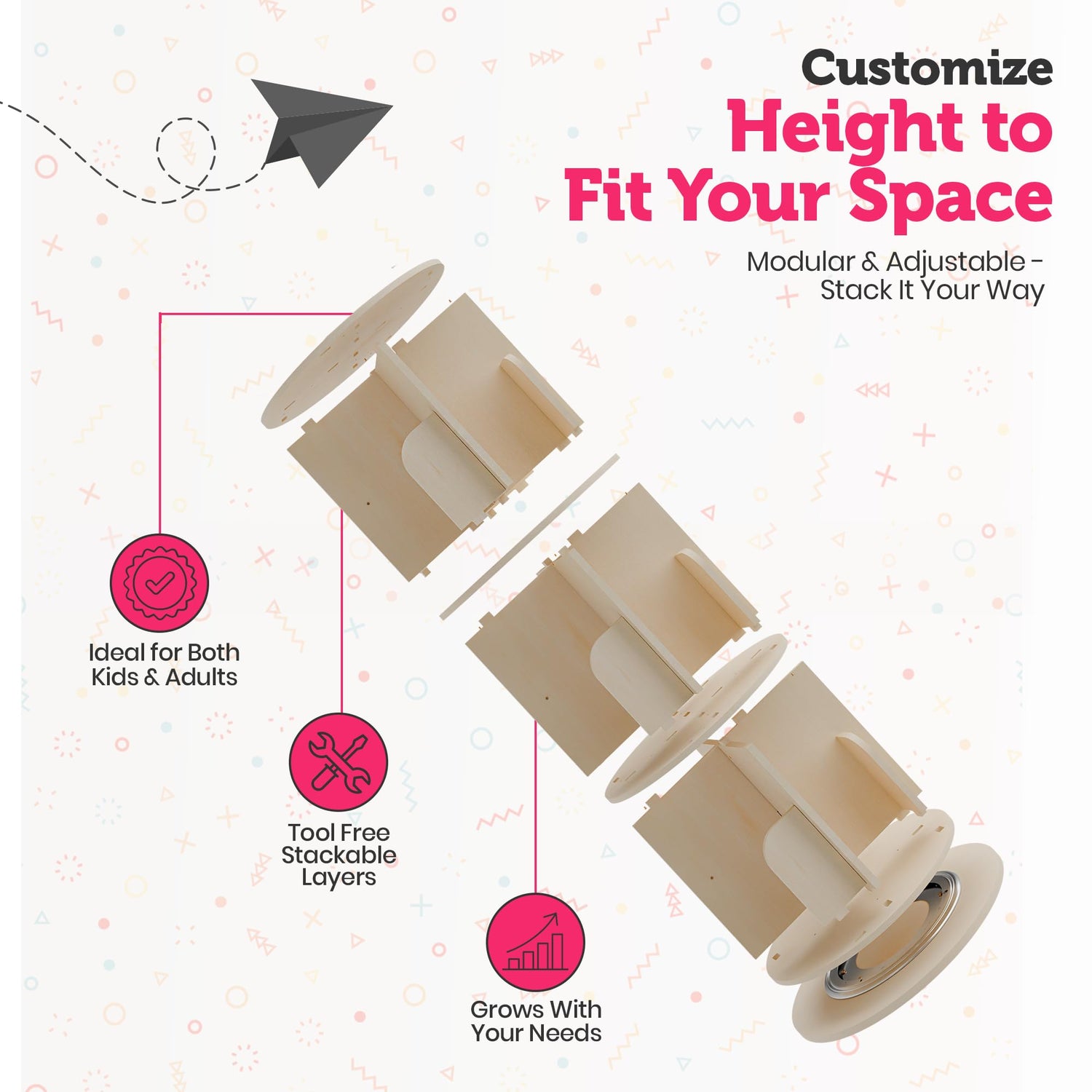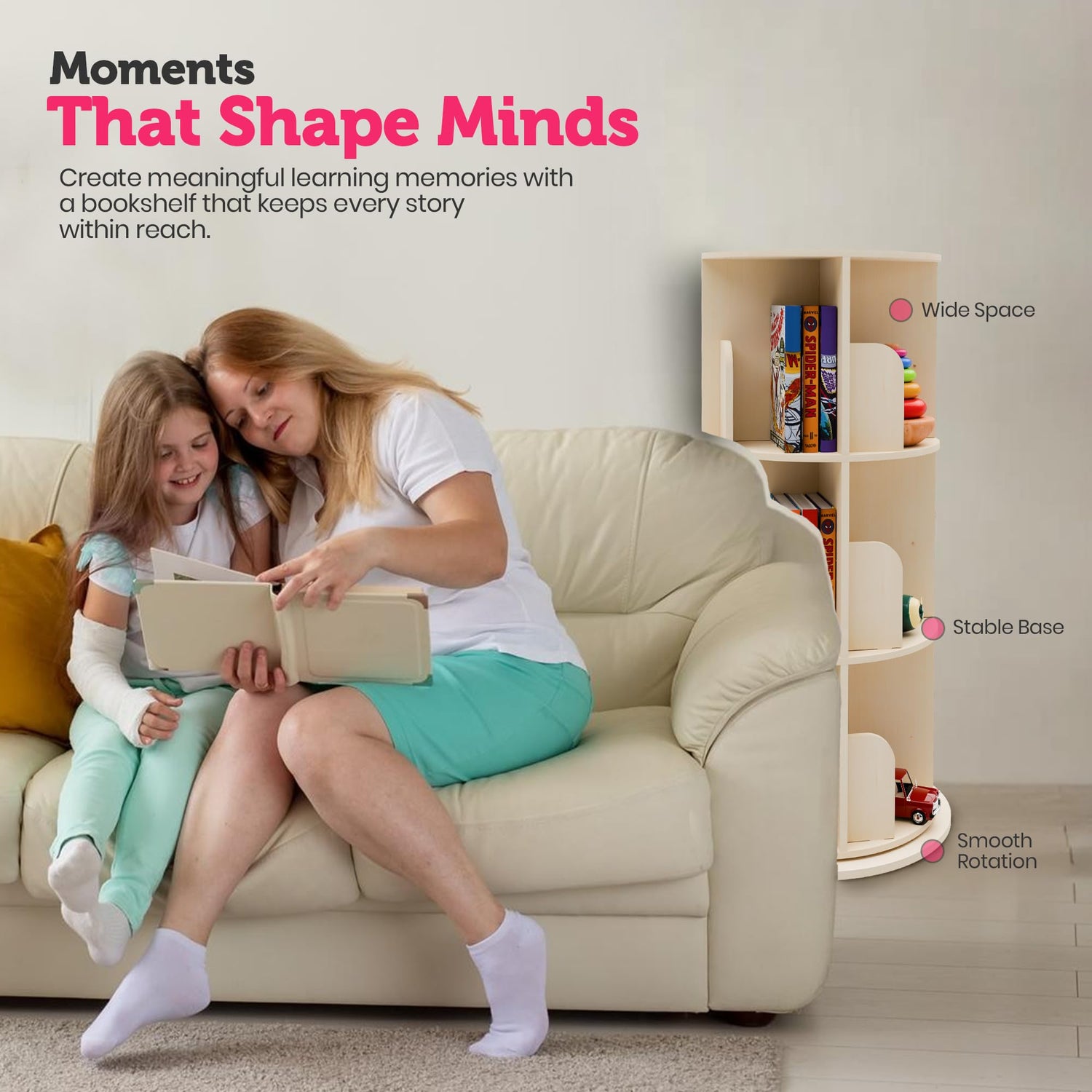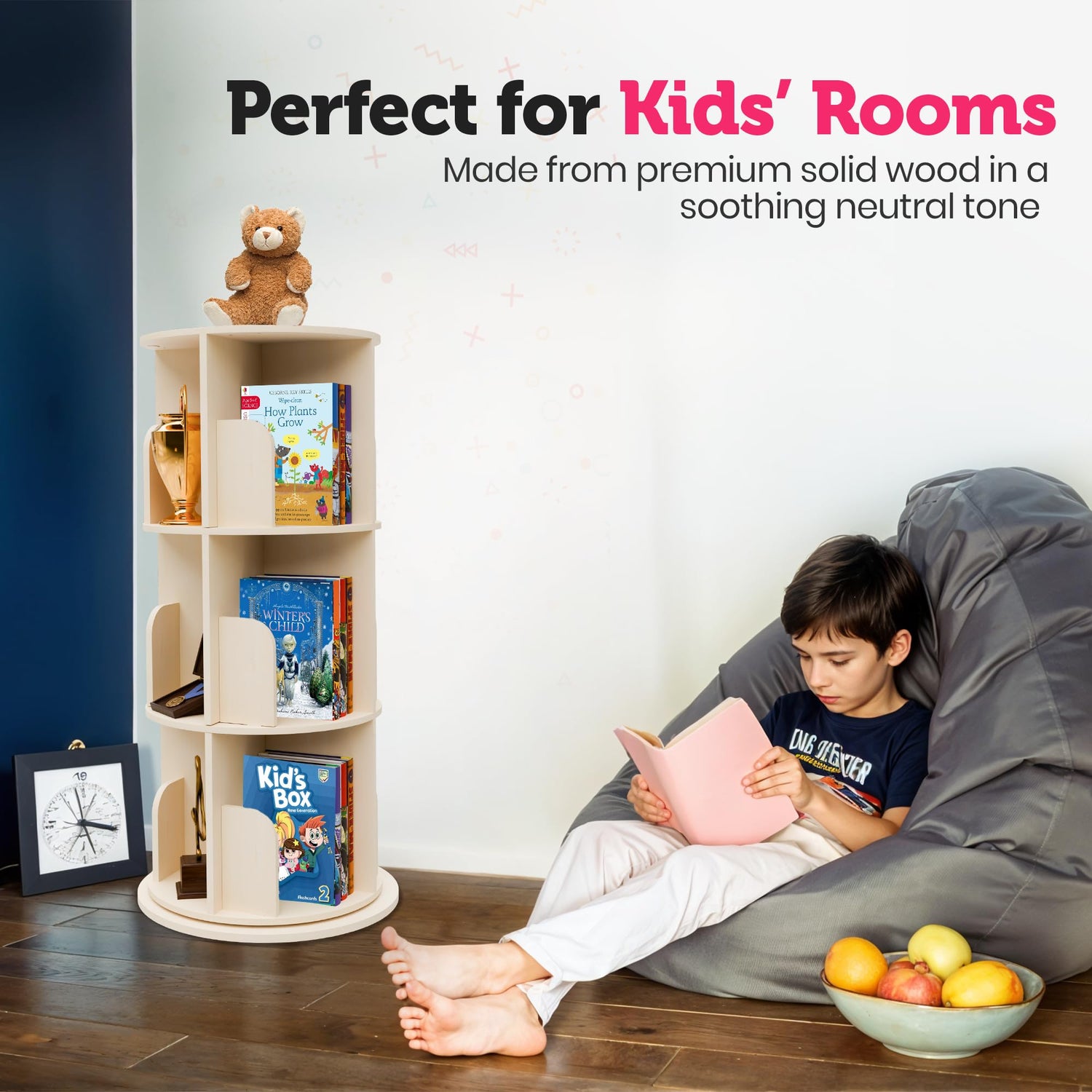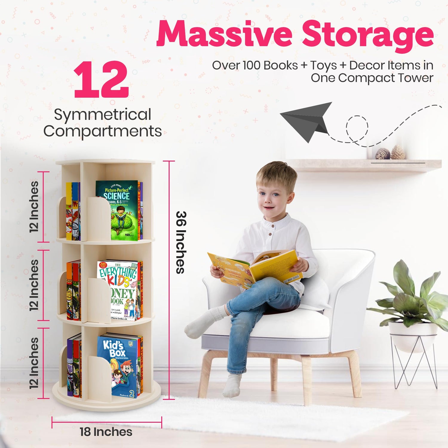 Rotating Kids Bookshelf – 3-Tier 360° Spinning Bookcase Tower, Solid Pine Wood, 12 Cubbies, Toddler Bookshelf Organizer & Lazy-Susan Storage for Nursery, Classroom or Playroom (Natural Finish)