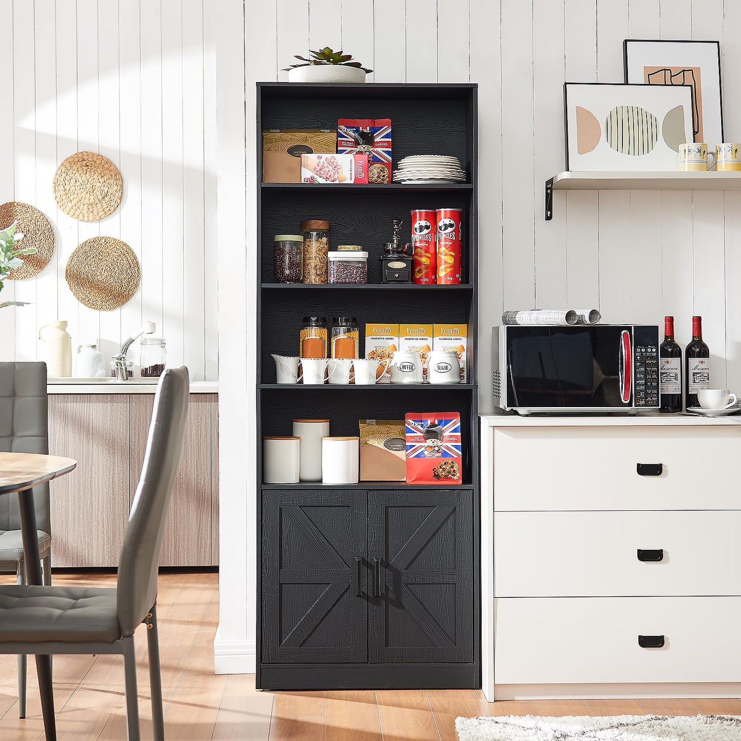 RWYHG 70in Tall Bookshelf 6 Tier Bookcase with Barn Doors and Adjustable Shelf, Black Farmhouse Book Shelves with Storage Cabinet,Wood Floor Standing Display Bookshelve for Bedroom,Living Room,Kitchen