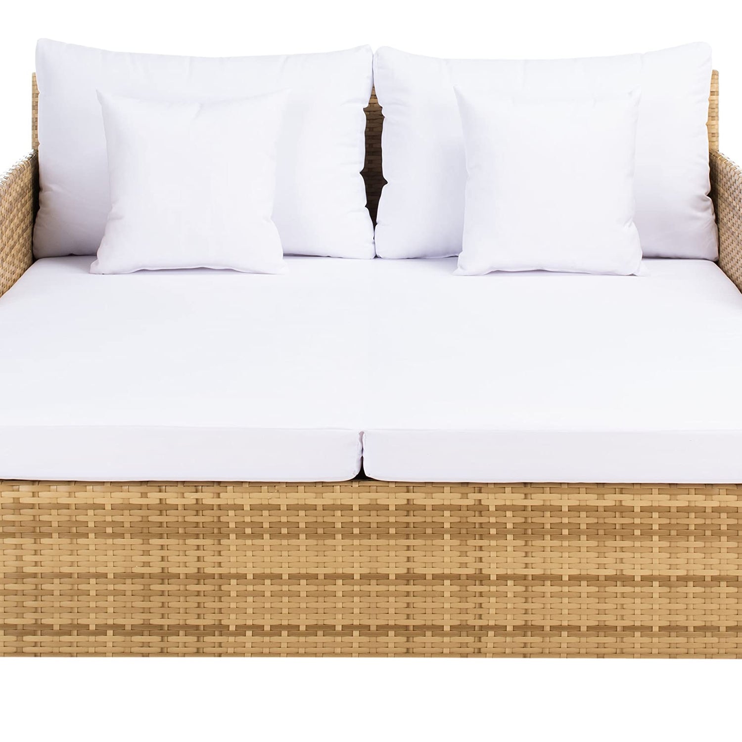 - [PLUSH COMFORT & DURABILITY]: Crafted from sturdy natural hued faux wicker with a steel frame and plush white cushions and pillows