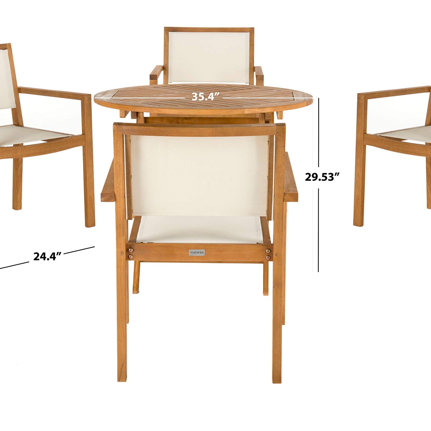 Details: For endless fun in the sun look no further than this classic 5-piece dining set. A modern investment, its 34.5 round dining table and four ample chairs are crafted in a teak hue and feature timeless white upholstery. Designers love its versatility and value.