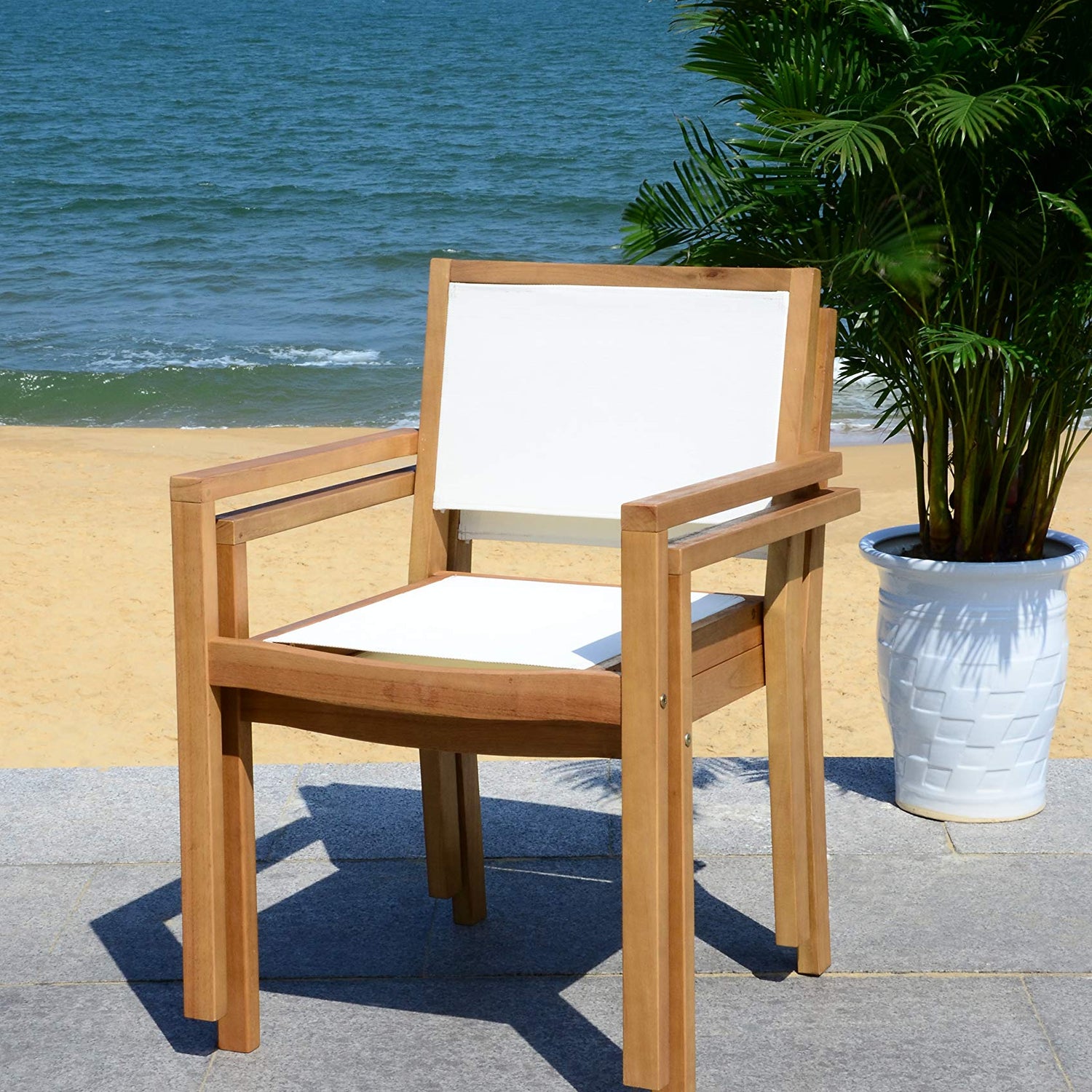- The teak finish and white upholstry of this dining set will add the perfect accent to any outdoor space
