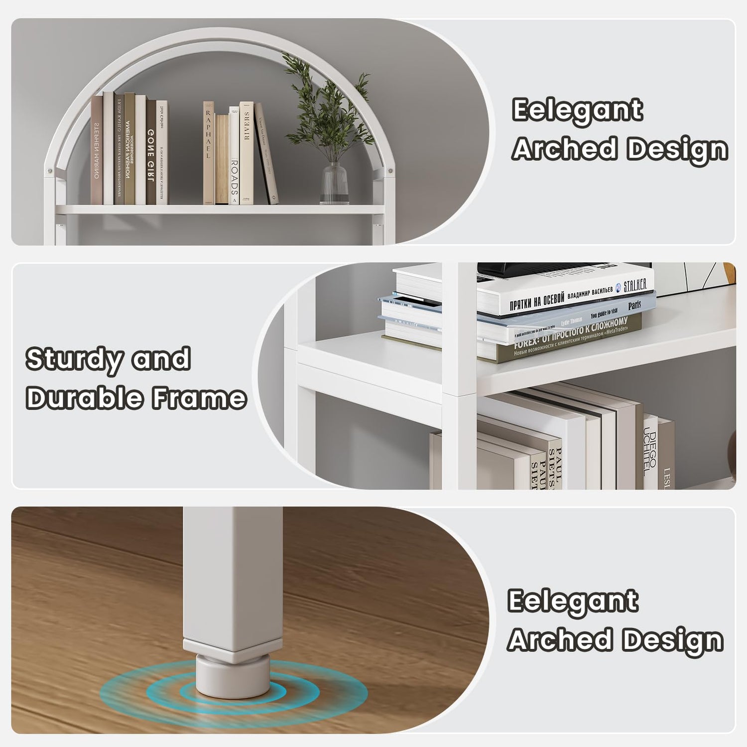 - ๐๐๐ซ๐ฌ๐๐ญ๐ข๐ฅ๐ ๐๐ญ๐จ๐ซ๐๐ ๐ ๐๐ฉ๐ญ๐ข๐จ๐ง๐ฌ: With 4 open shelves and 1 hidden storage cabinet, this arched bookcase offers ample space for books, decor, and more, ensuring both style and functionality