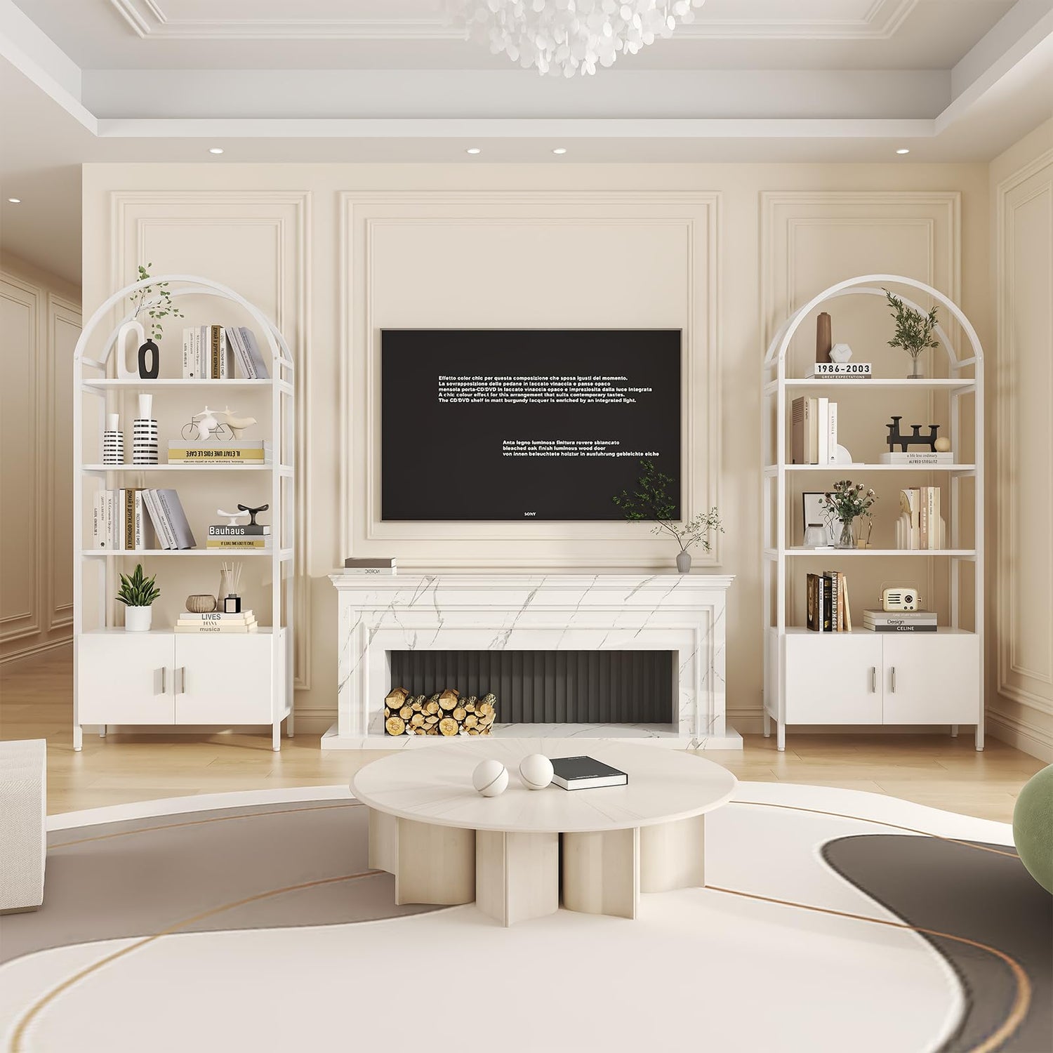 Saudism Arched Bookshelf with Doors, 71" Tall Industrial Bookcase with Sturdy Metal Frame, Freestanding Display Shelving Unit, White Geometric Book Shelf for Lving Room, Bedroom, Home Office