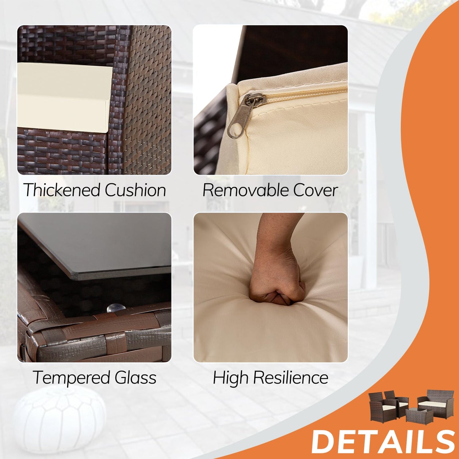- EASY TO CLEAN:The patio furniture set features a table made of high-quality tempered glass that can be used to place beverages, food, and beautiful decorations. The cushion cover has a zipper which makes it easy to remove the cover and the splash-proof material is easy to clean.