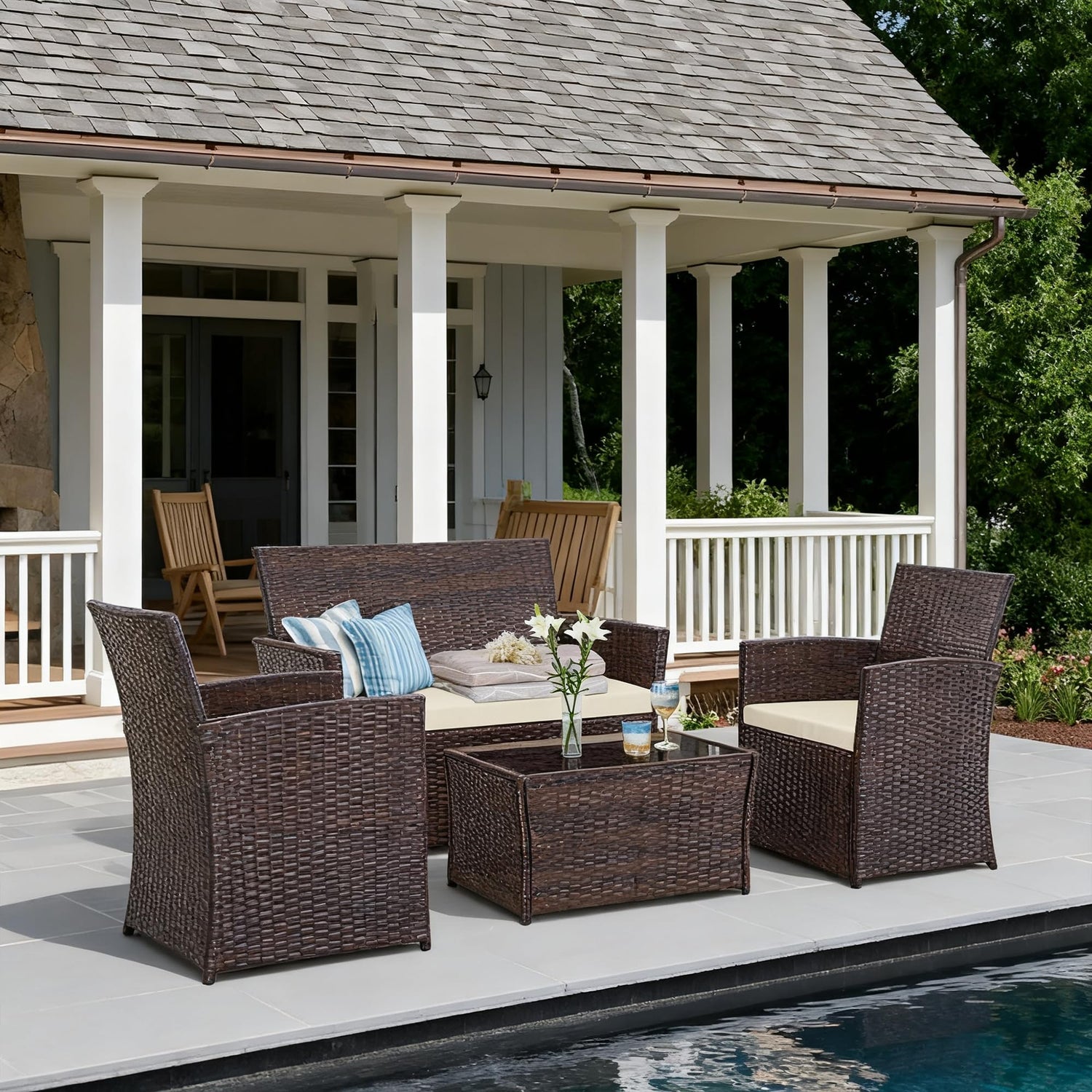 - ALL-WEATHER WICKER: Crafted with high-quality PE wicker, our furniture set is built to withstand various weather conditions, allowing for year-round use. The durable material ensures that the set maintains its appeal and functionality.Note: cushions are not water-proof, When you don' t use it, advise you to take cushions inside for longer service time.