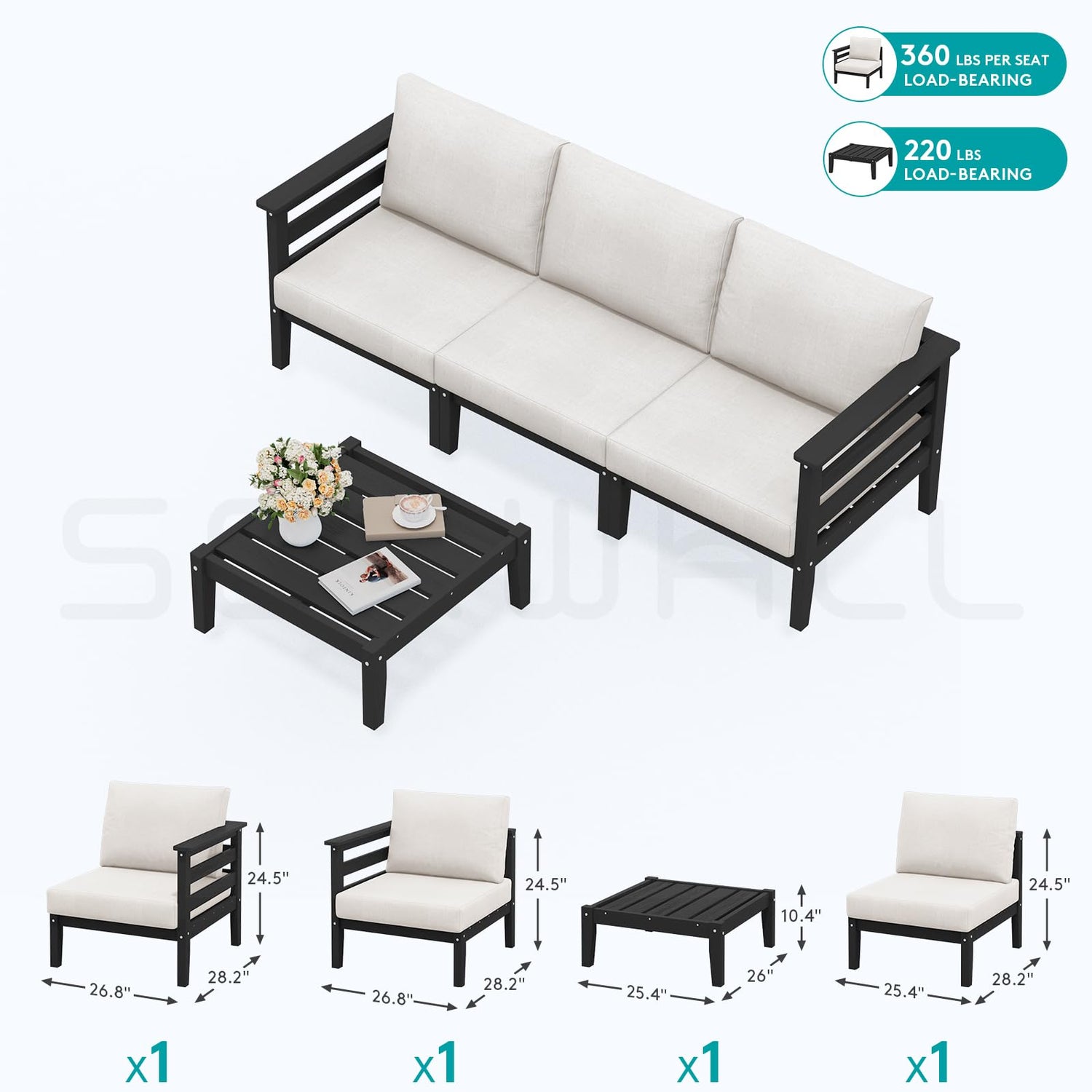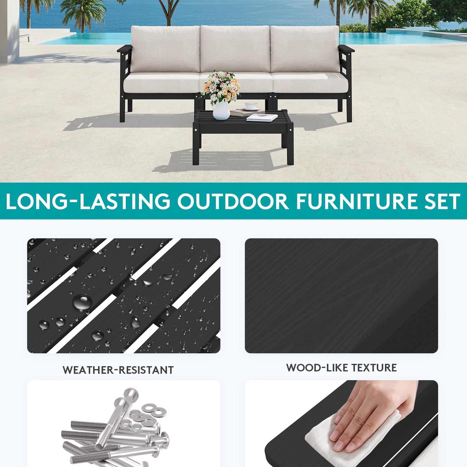 SERWALL HDPE Outdoor Furniture Set, 4 Pieces Patio Sectional Sofa Set, All-Weather Wood-Like Outdoor Sofa with Coffee Table for Deck, Garden, Black Frame with Khaki Cushion