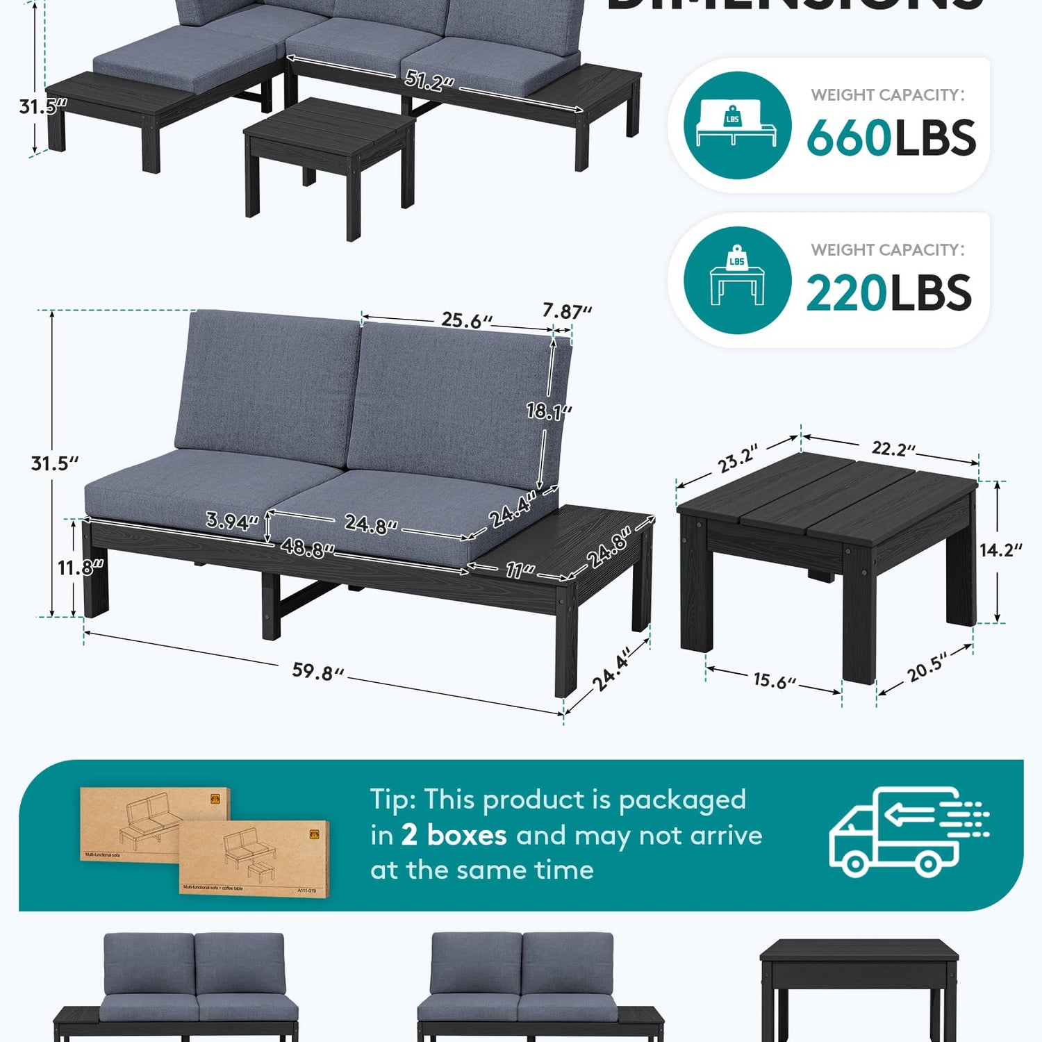 - Spacious & Stable Design: Two extra-long 2-seater loveseats (59.8"L x 24.8"W x 31.5"H each) with built-in side tables (11"L x 24.8"W each) and one coffee table (23.2"L x 22.2"W x 14.2"H). Longer than standard loveseats, each loveseat supports 660 lbs, coffee table 220 lbs, providing ample, sturdy seating for people of all sizes, ideal for patio or backyard gatherings.