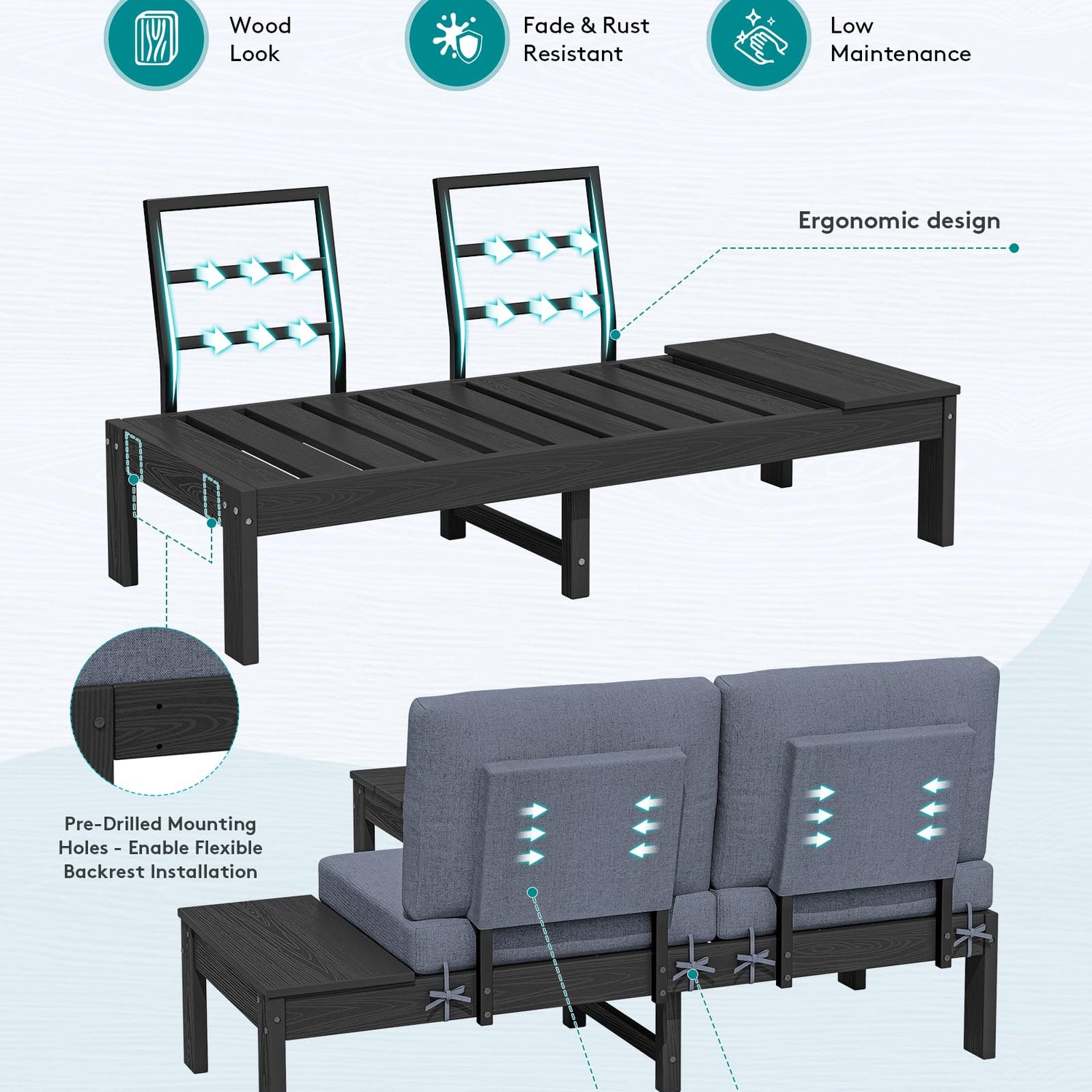 - Pre-Drilled Backrest Holes: Easily adjust or reverse the backrest to create your ideal modular patio furniture layout. Arrange as L-shaped, U-shaped, or separate seating to fit any sectional sofa, outdoor lounge set, or patio seating area