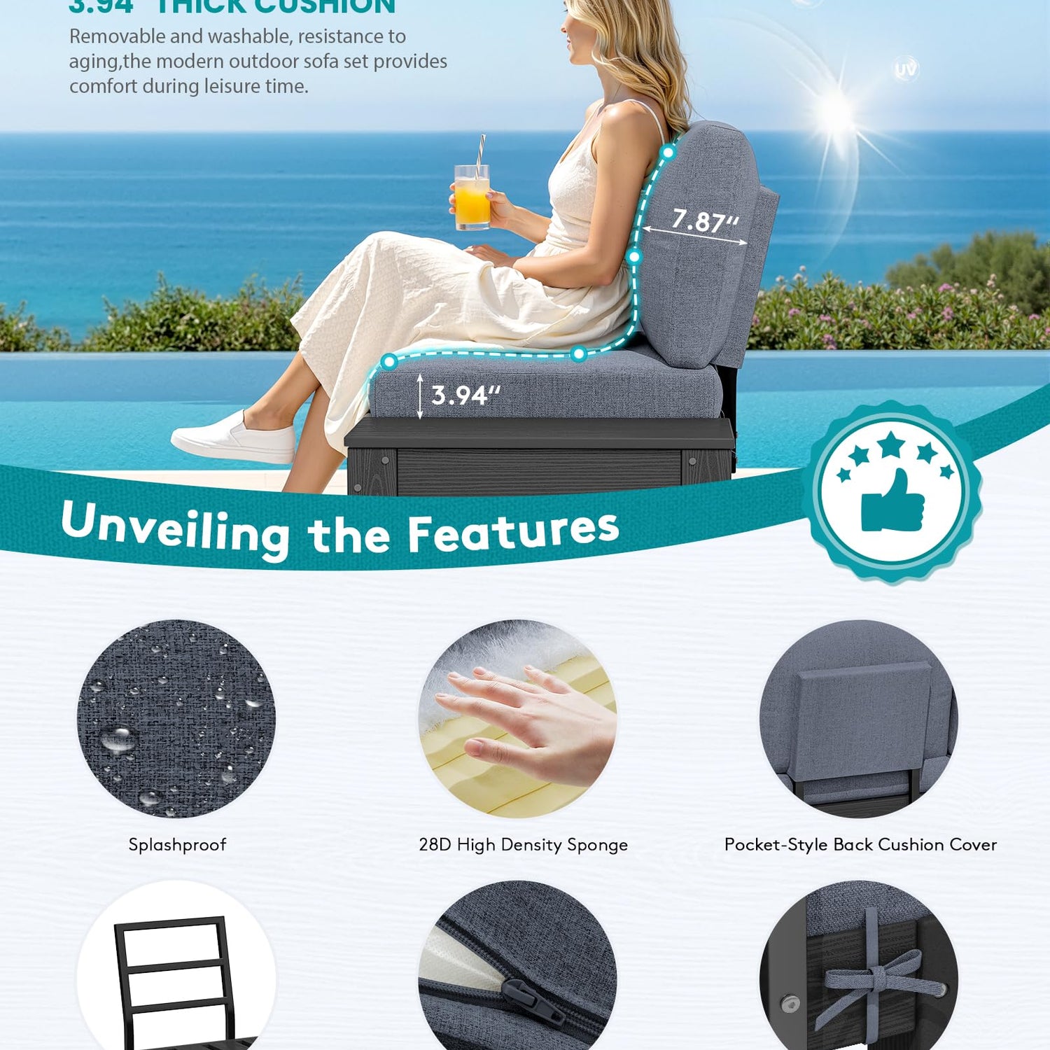 - Upgraded Cushions for Comfort: Featuring 3.94" thick high-density foam seat cushions and 7.87" plush back pillows, and our outdoor chair cushions are made of a 3-layer construction, with thick high-quality lay-flat cotton on the top and bottom layers, and thick 28D high-density sponge in the middle layer, this patio couch set delivers ergonomic support and lumbar support for long hours of relaxation or socializing outdoors