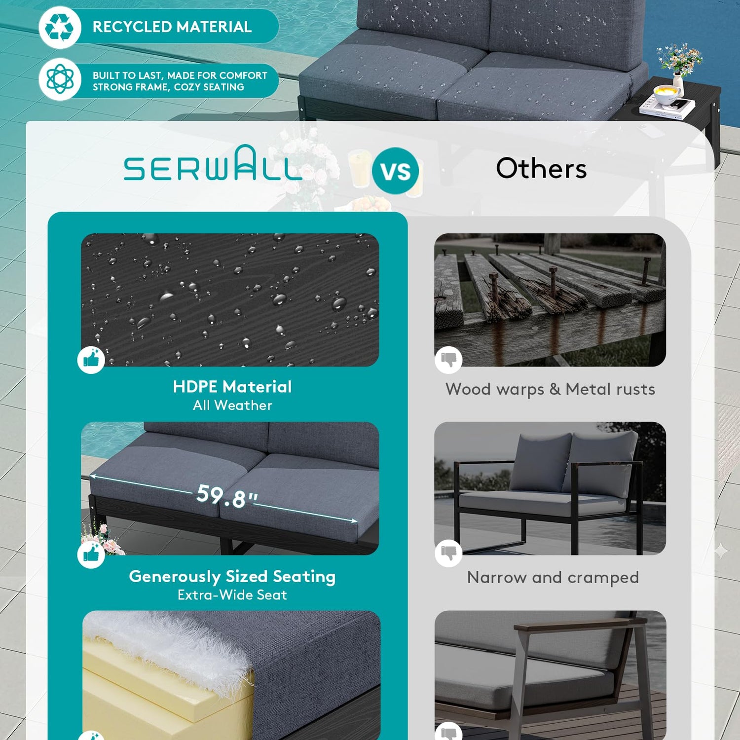 - All-Weather HDPE Material: Crafted entirely from weather-resistant HDPE with a realistic wood texture, this sofa withstands sun, rain, and cracking. Assembled with rust-resistant 304 stainless steel screws, it keeps your outdoor space stylish, comfortable, and worry-free for years to come