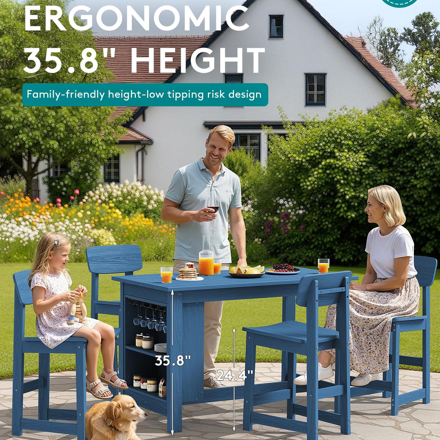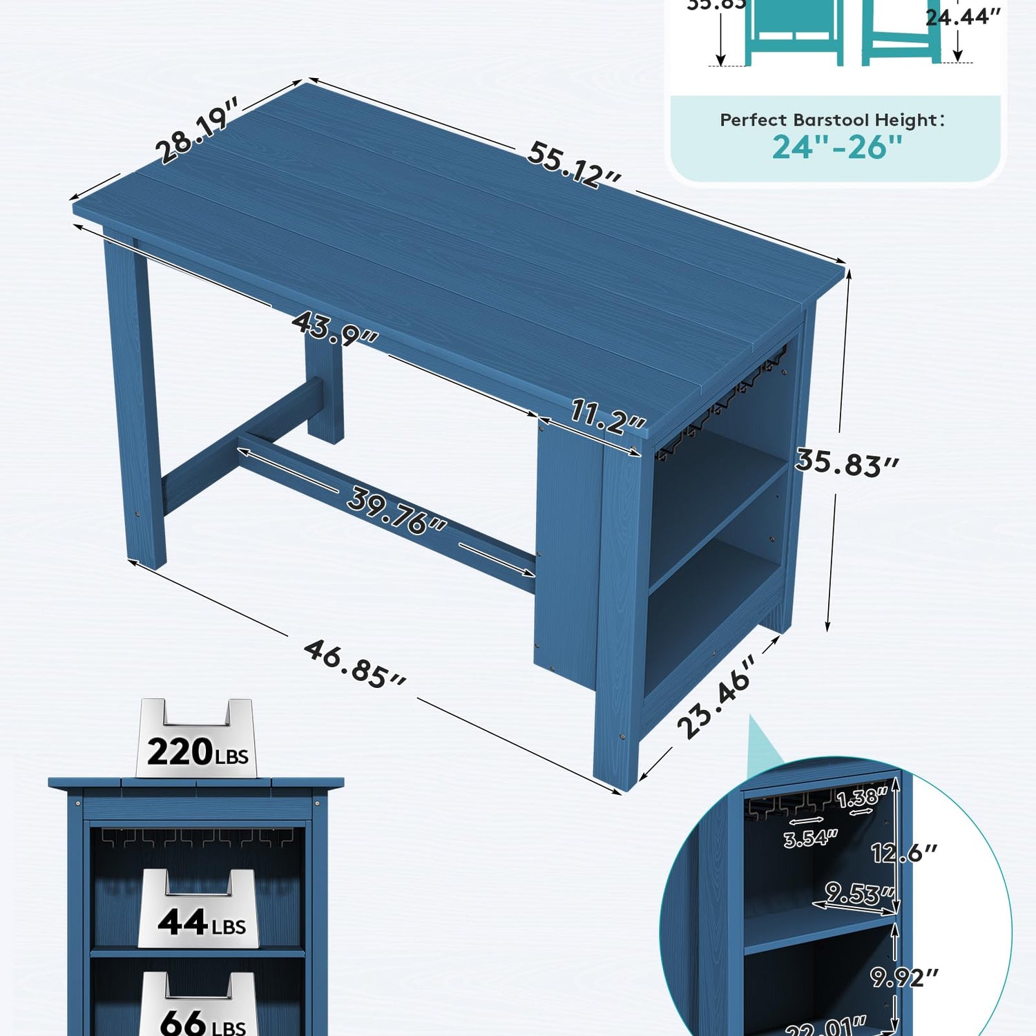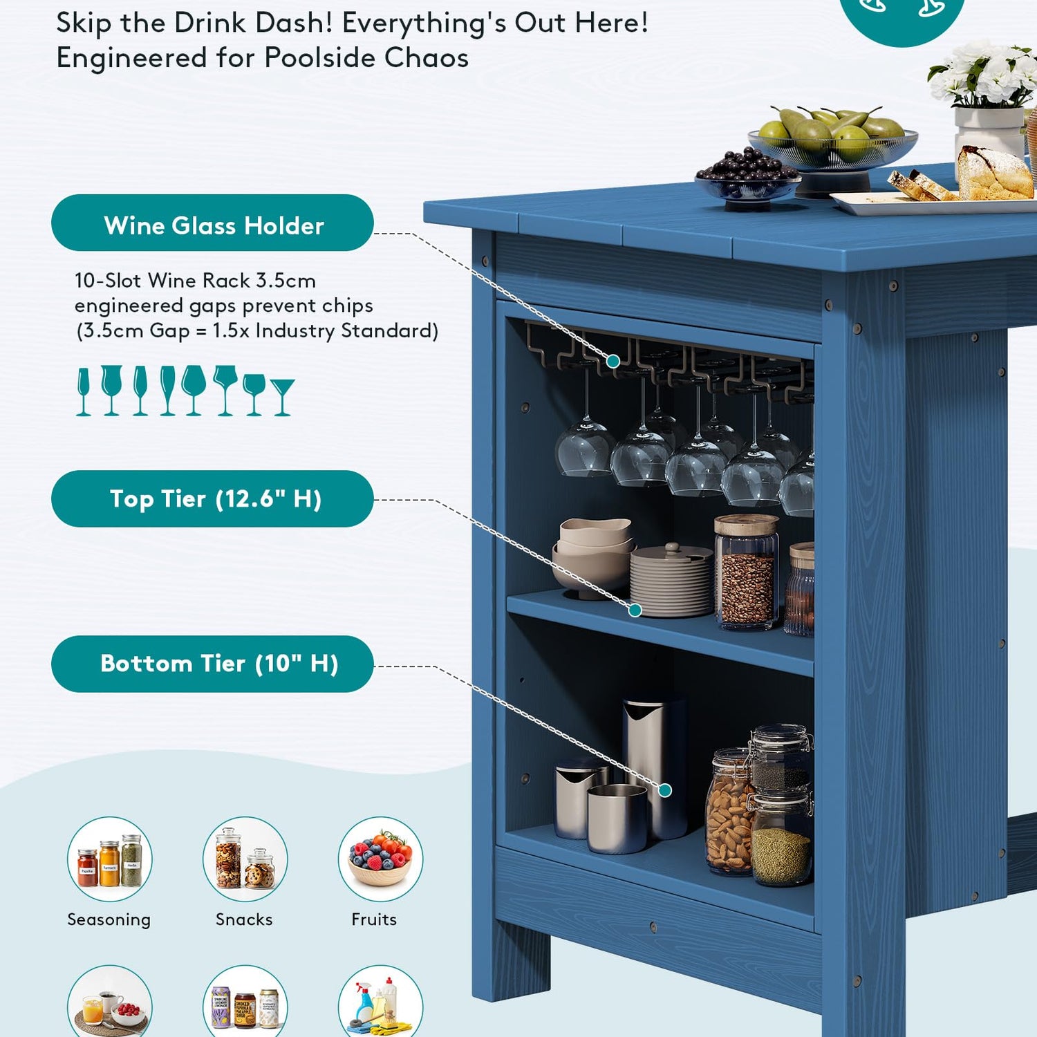 SERWALL Outdoor Bar Table, All Weather HDPE 36" Counter Height Dining Table with Storage and Wine Rack for Patio, Garden, Backyard, Balcony, Poolside, Blue