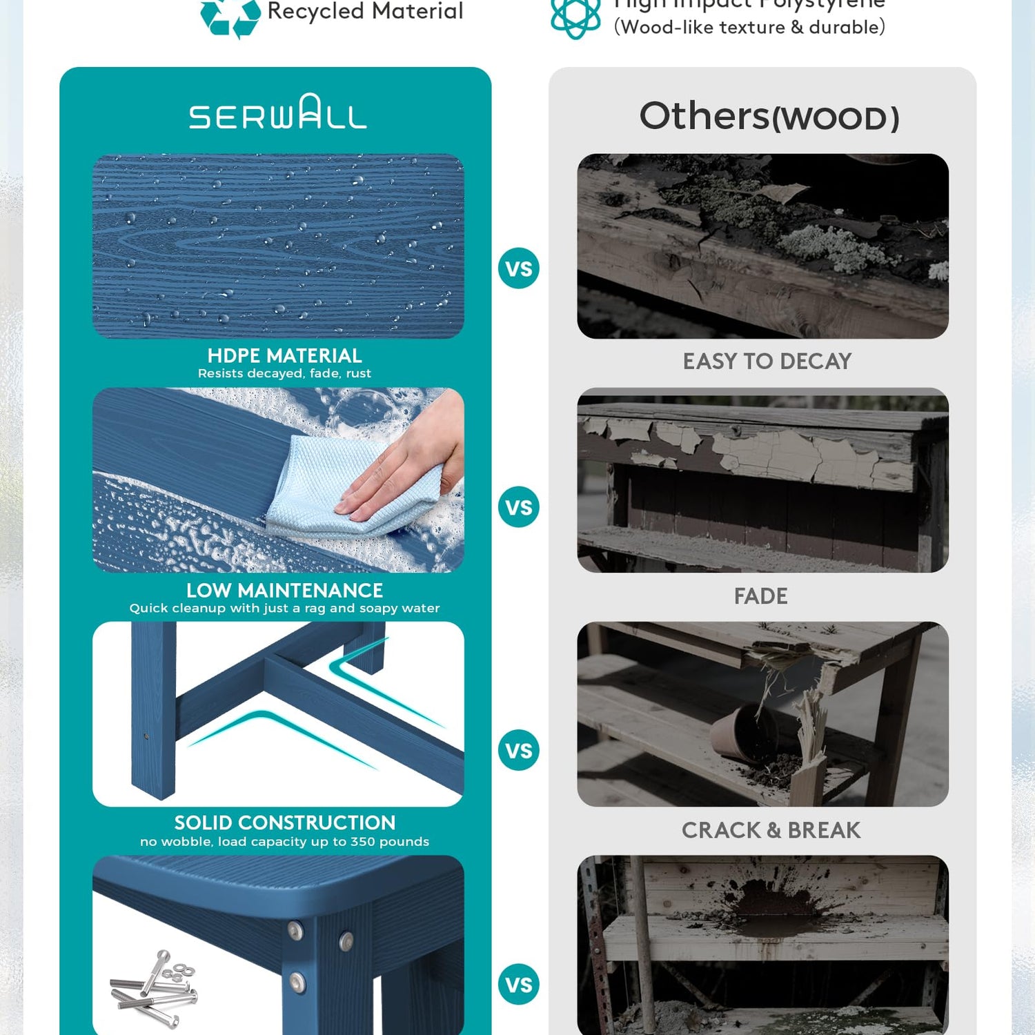 - All-Weather Use: SERWALL outdoor dining set features a exceptionally sturdy construction built for long-lasting use. Crafted from durable HDPE material, it withstands harsh sun, rain, and wind without fading, warping, or cracking. Maintenance is simple—just clean with soapy water to keep it looking new