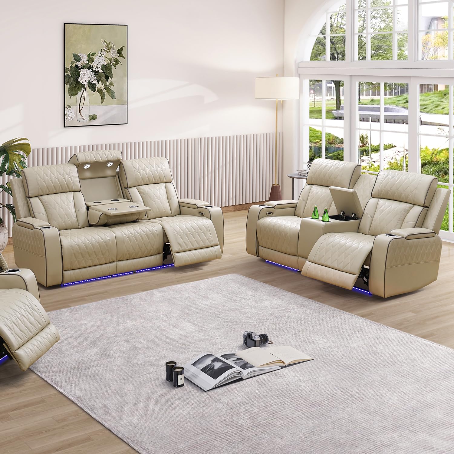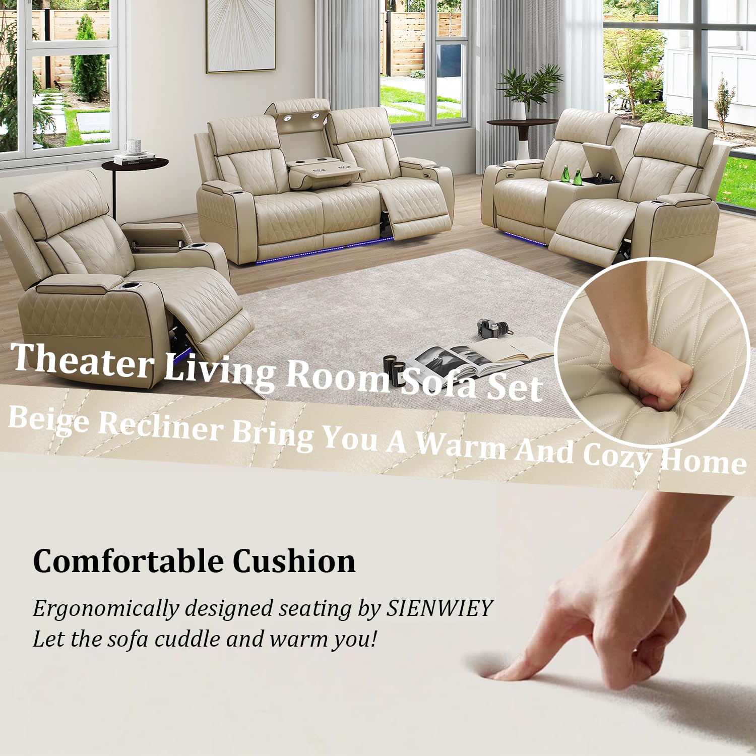SIENWIEY Leather Recliner Sofa Set with LED Light, Power Reclining Couch Set with USB Port, Leather Couch Set 2 Pieces for Living Room Home Theater Seating(Beige,Sofa and Loveseat)