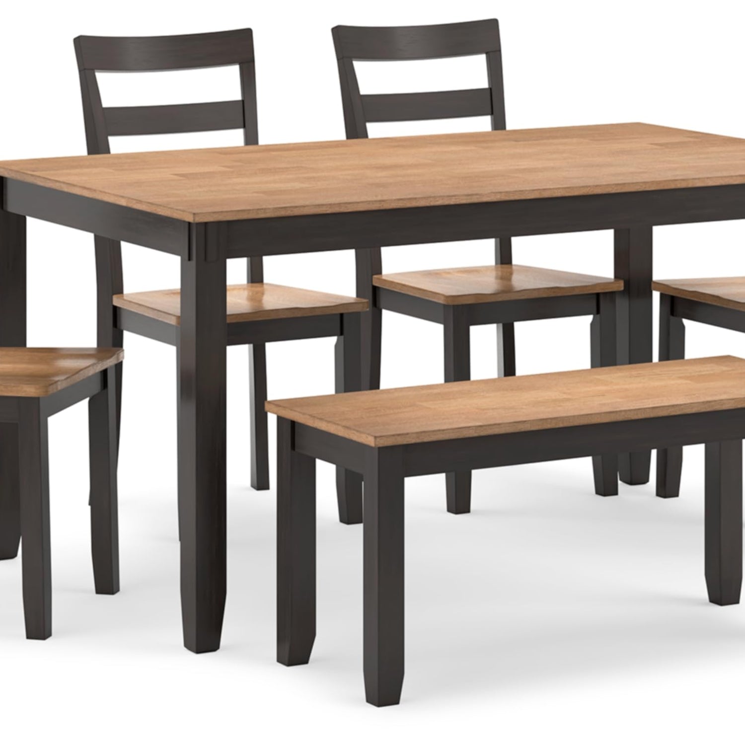 Details: Who says a simple design can't be eye-catching? This dining table, chairs and bench have a casually cool style, yet they still turn heads. The two-tone table and seating choices are effortlessly handsome. Ladderback chairs cater to your comfort with contoured seats, and the bench for two is right on trend. Aside from dining, this set's relaxed simplicity is perfect for homework, morning coffee or checking all those emails. Signature Design by Ashley is a registered trademark of Ashley Furniture Industries, Inc.