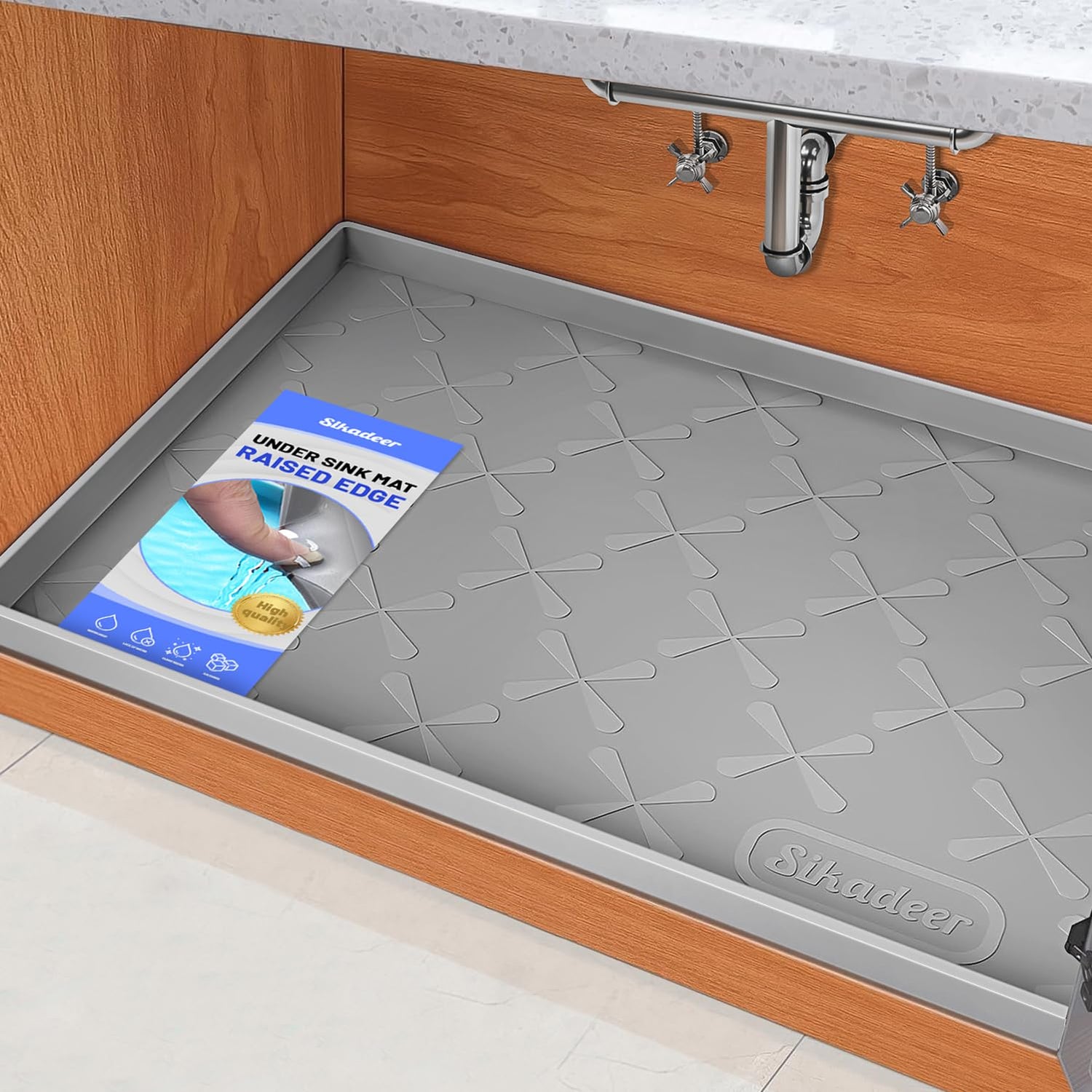 - Ultra Sink Protector: With raised edges up to 1.6cm and a thick 3mm design, the SIKADEER under sink mat protects your cabinets, shelves, and floors from leaks, stains, and scratches. It’s the easiest way to keep your kitchen clean and damage-free.