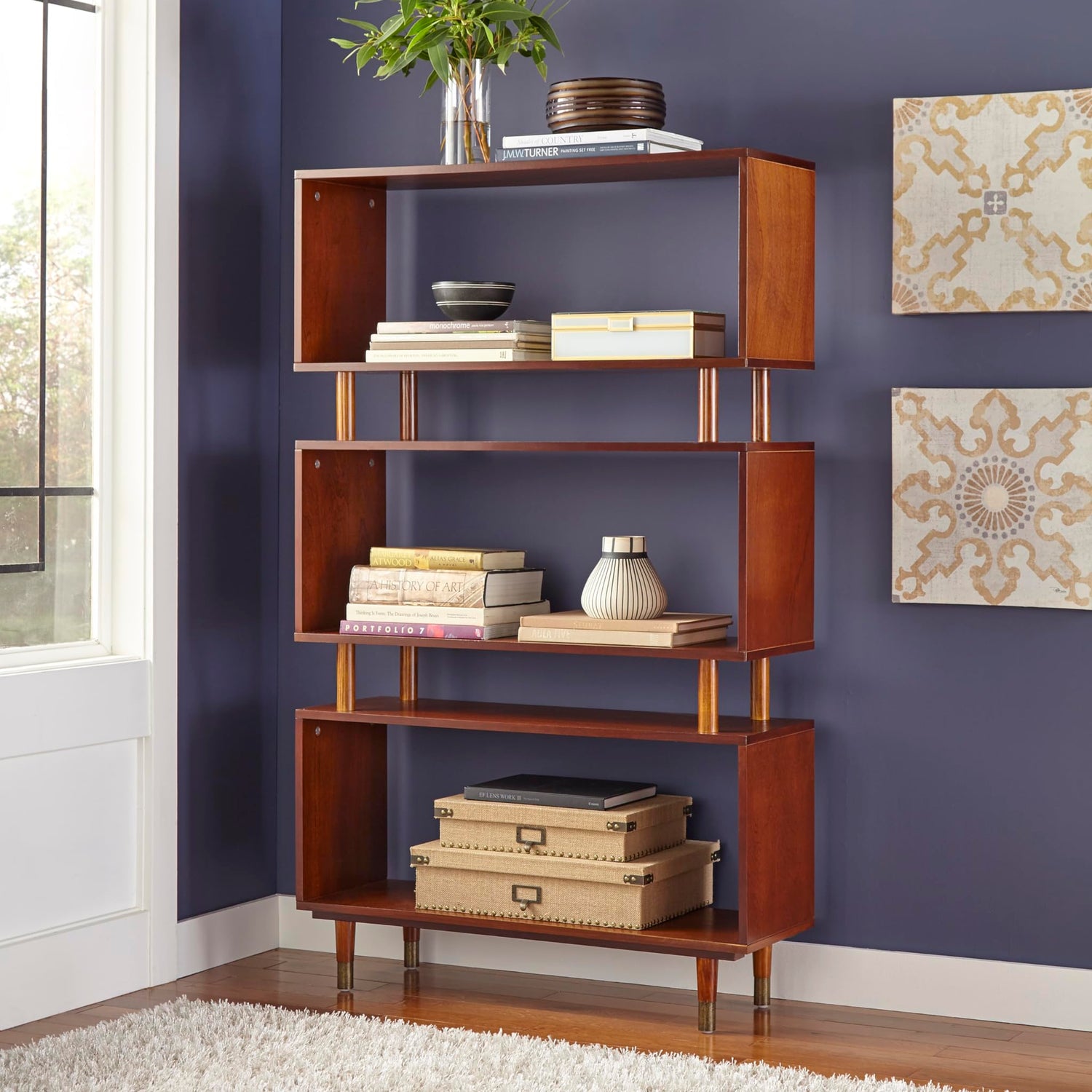 SilkWood Studio Margo 3 Tier Bookshelf, Mid Century Bookcase for Living Room, Bedroom Furniture & Home Office, Solid Wood Storage Shelves with Gold Legs, 59.5" Tall Modern Book Shelf, Walnut