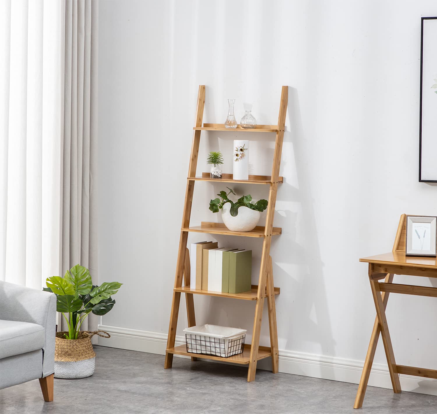- 【Bamboo Ladder Shelf】Made of 100% natural bamboo, which is environmental, also durable.