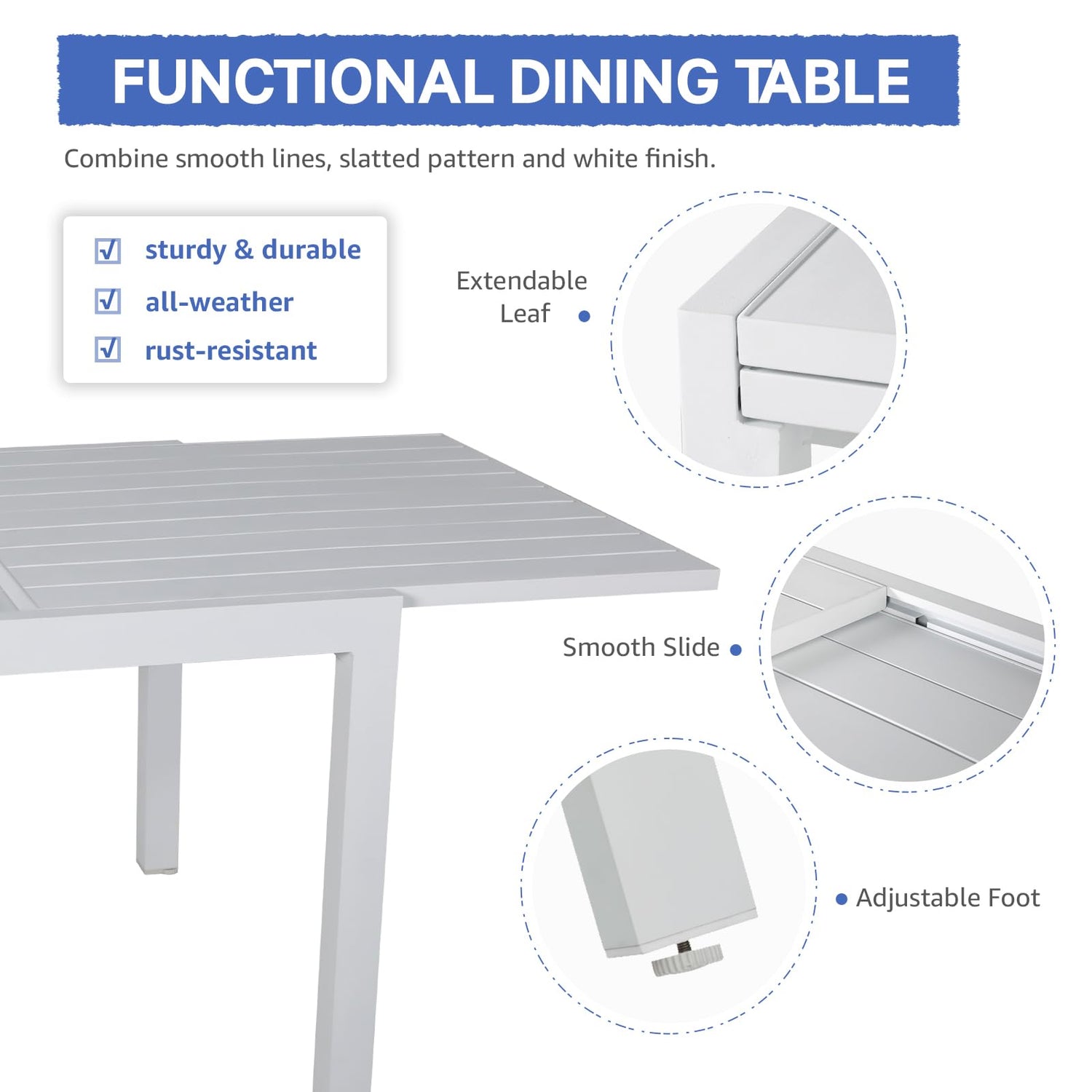 - 【DURABLE FRAME & FUNCTIONAL DETAIL】: Durably made of solid aluminum with a rust- and weather-resistant finish, helping ensure a sturdy dining table set that lasts for years to come. Also, there are adjustable leveling feet to stay balanced and protect the rectangular table during movement.