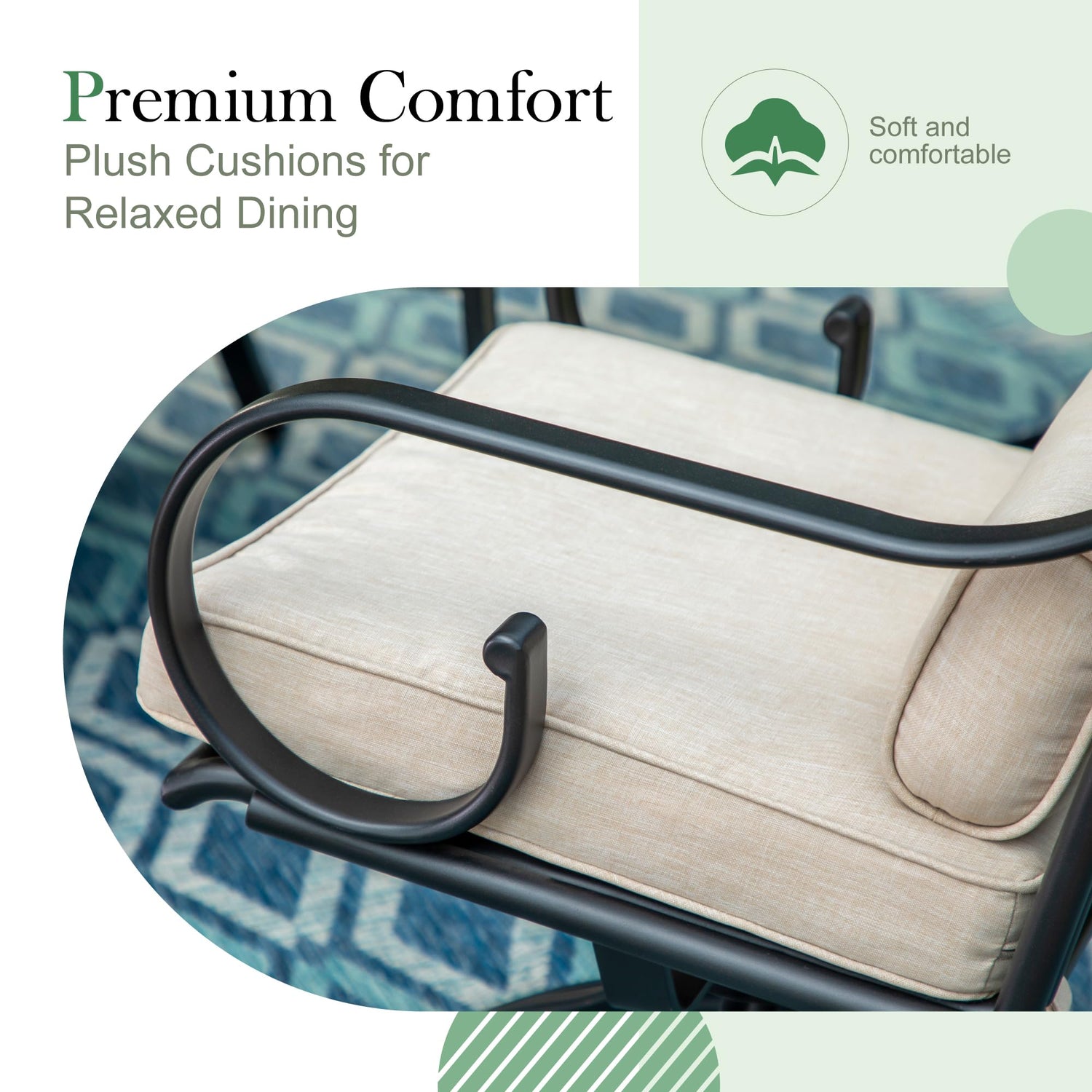 • Enhanced Seating Comfort: Ample seating space, thick seat cushions and waist pillows allow you to relax and enjoy your outdoor meals for extended periods. 2 swivel dining chairs included, 360-degree swivel design allows you to effortlessly engage in conversations with family for friends. Chairs: Seat height: 15", Seat width: 20", Seat depth: 20", Total height: 37". Weight capacity: 350 lbs