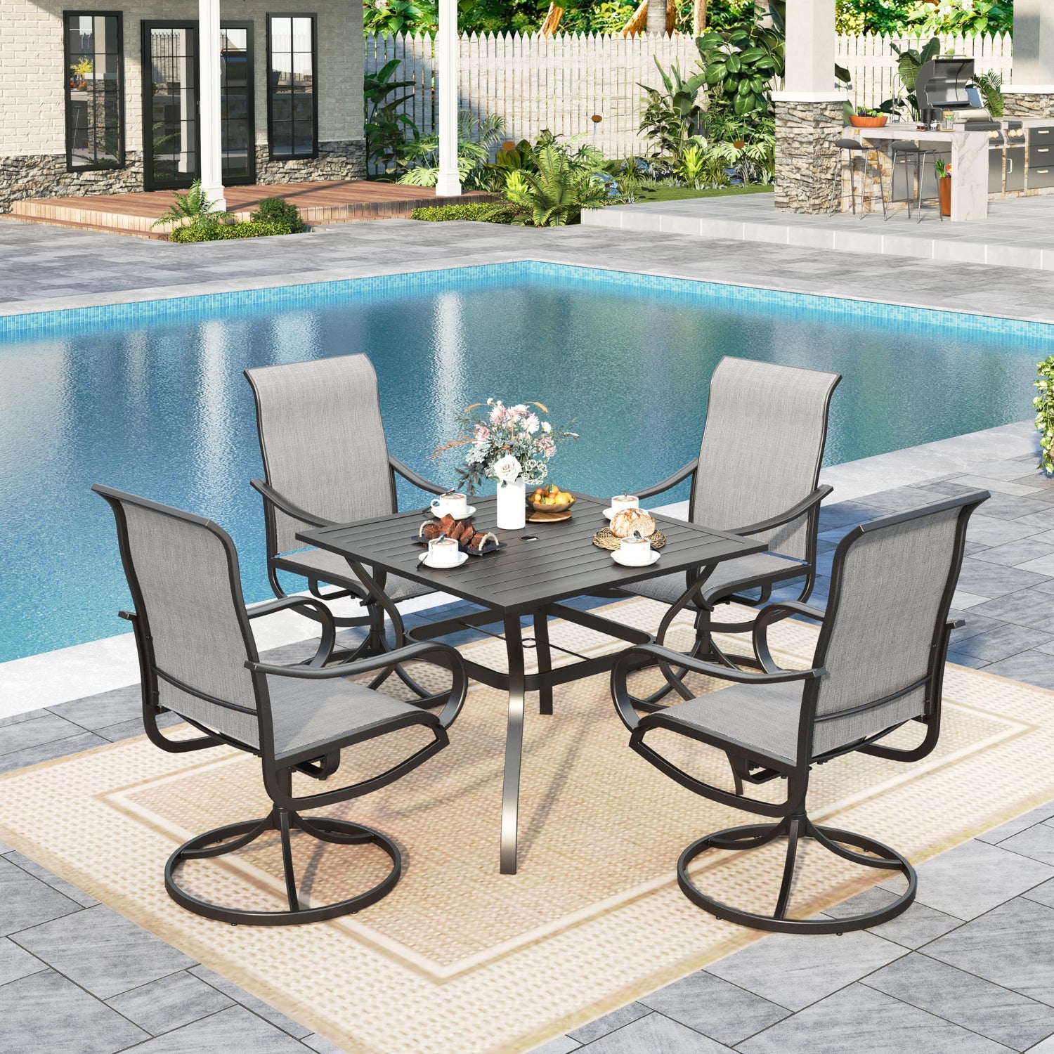 - E-coating Technology: Our furniture is coated with advanced E-coating technology, ensuring superior durability and a longer lifespan. The set includes a 4-person dining table paired with swivel chairs, making it perfect for a family of four. Enjoy the outdoors with this durable and stylish set that's designed to last