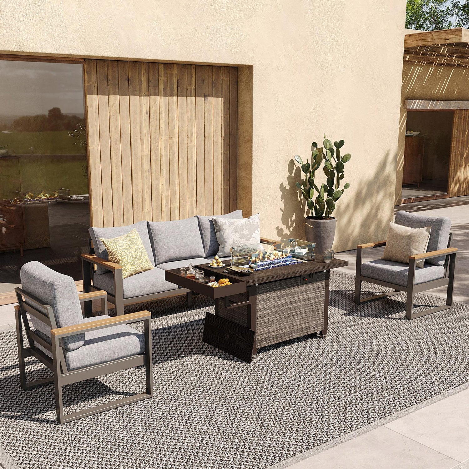 - Reliable Warmth: The outdoor sectional with fire pit has 50,000 BTU fire pit, equipped with a wind guard, provides generous heat and a steady flame for outdoor gatherings; it's perfect for creating a cozy ambiance during family conversations or evening soirees, without the chill