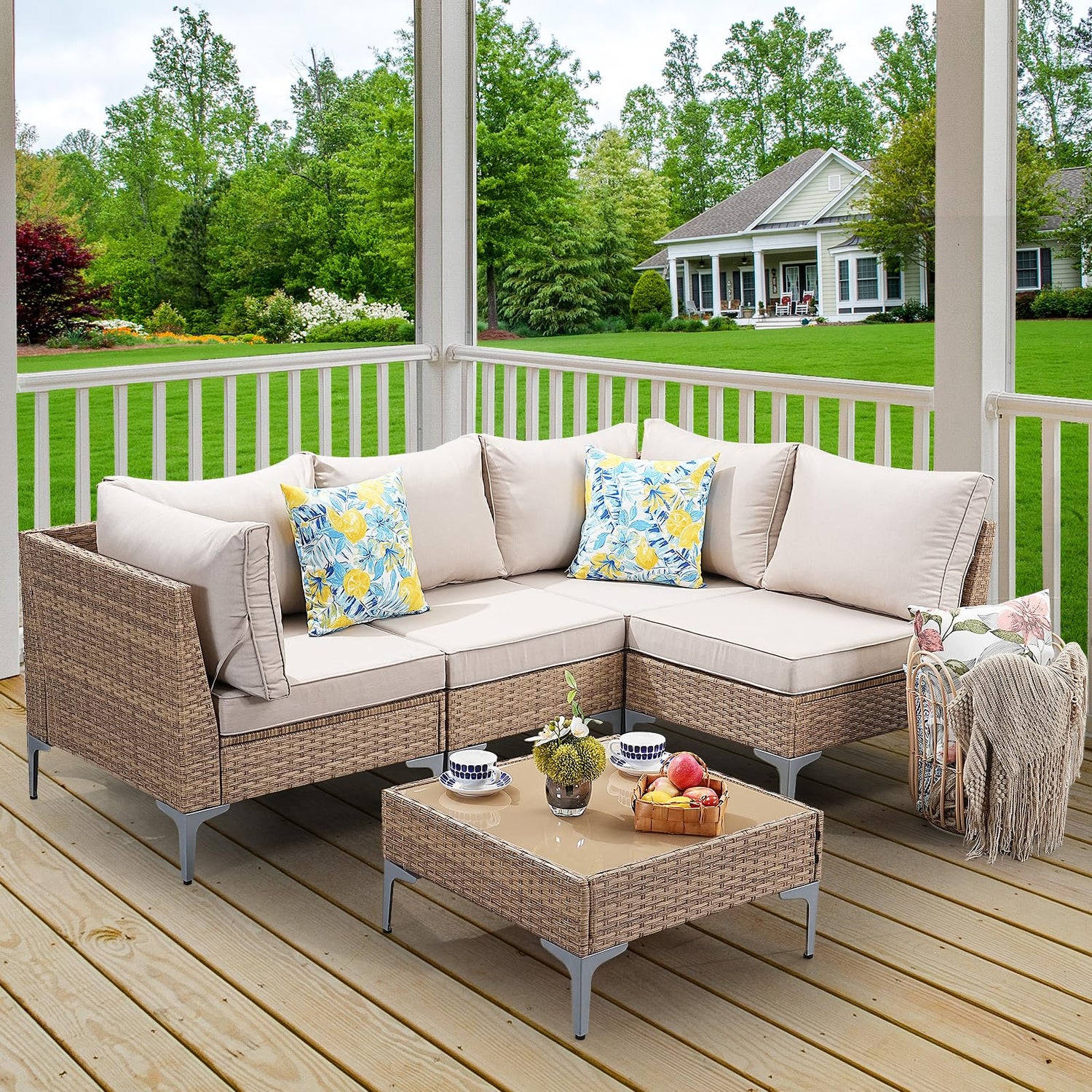 SunloungeCo 5-Piece Patio Furniture Set, Outdoor Wicker Sectional Sofa with Coffee Table, Anti-Slip & Thick All-Weather Cushions for Sunroom,Garden,Backyard, Beige