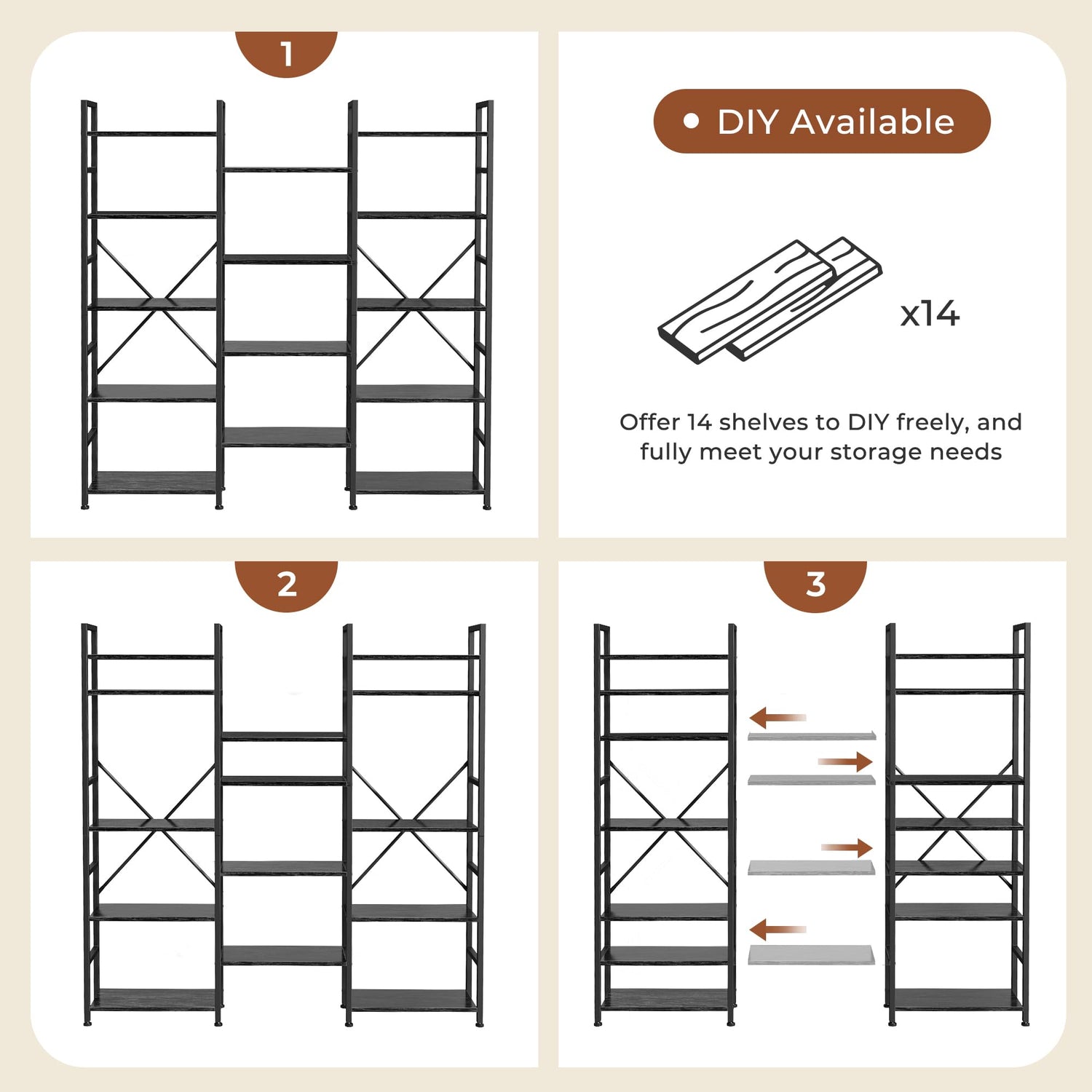 SUPERJARE Triple 5 Tier Bookshelf, Bookcase with 14 Open Display Shelves, Wide Book Shelf Book Case for Home & Office, Black