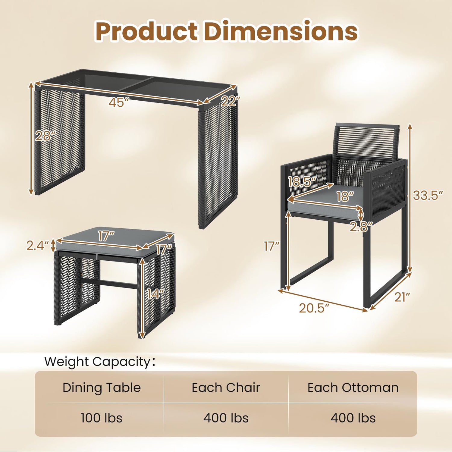 Dimensions of Each Ottoman Cushion: 17” x 17” x 2.4”(W x D x Thickness)