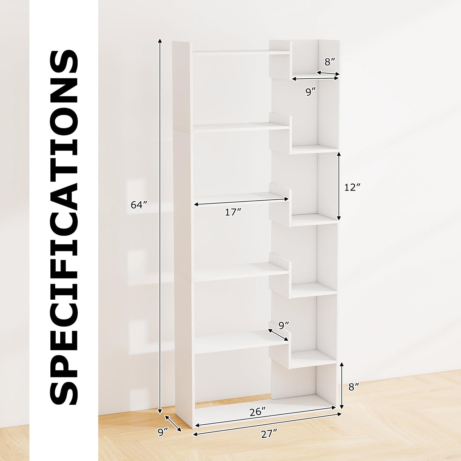 - 11-Shelf Large Storage Space: This large bookshelf features 11 shelves to make the most of vertical space. It can easily hold your photo frames, storage boxes, potted plants, books and magazines, making your home away from clutter. Overall Dimensions: 27” x 9” x 64” (L x W x H)