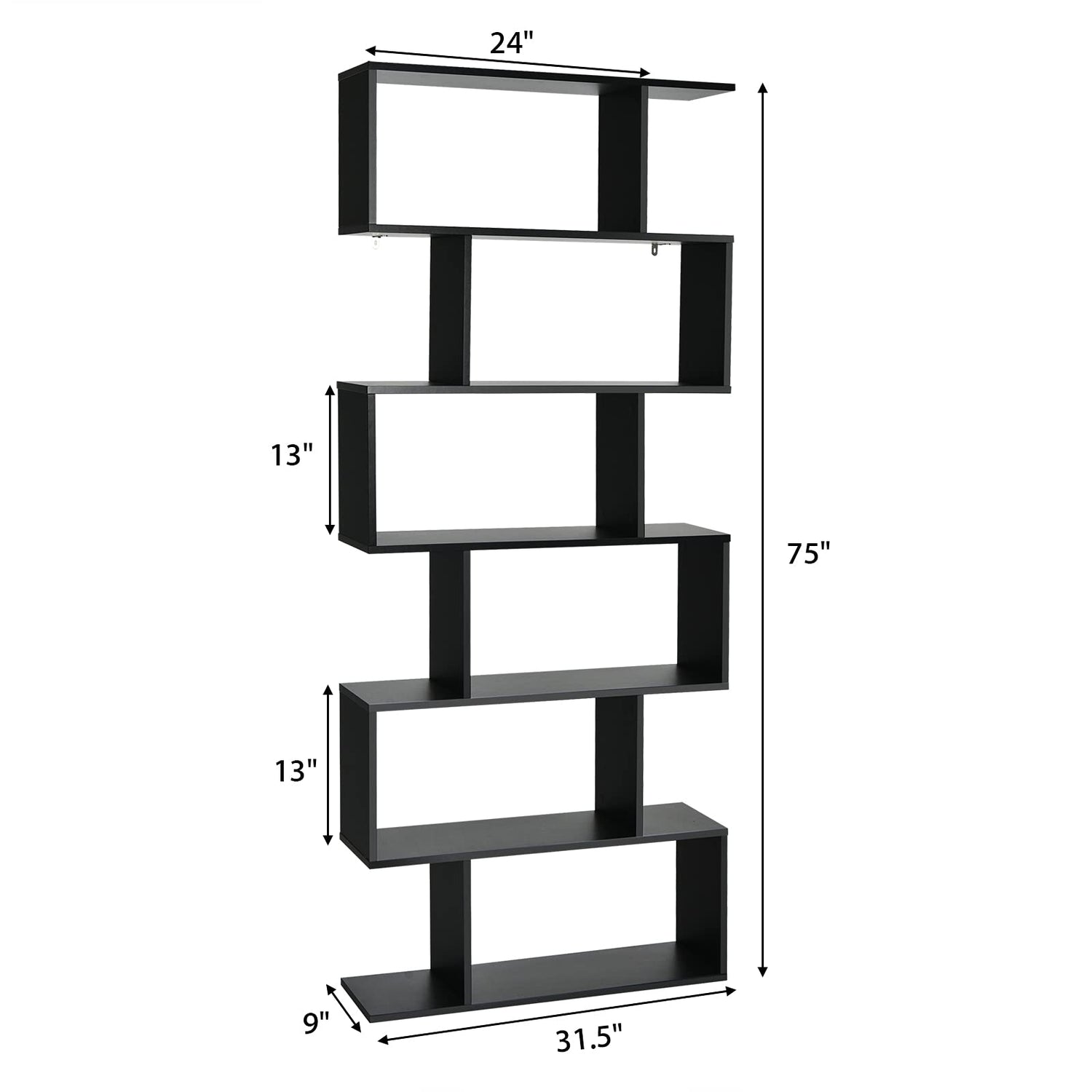Tangkula 6-Tier Geometric Bookcase, Modern S-Shaped Storage Display Bookshelf for Living Room, Anti-Toppling Device, Home Office Wooden 6 Shelf Open Bookcase (2, Black)