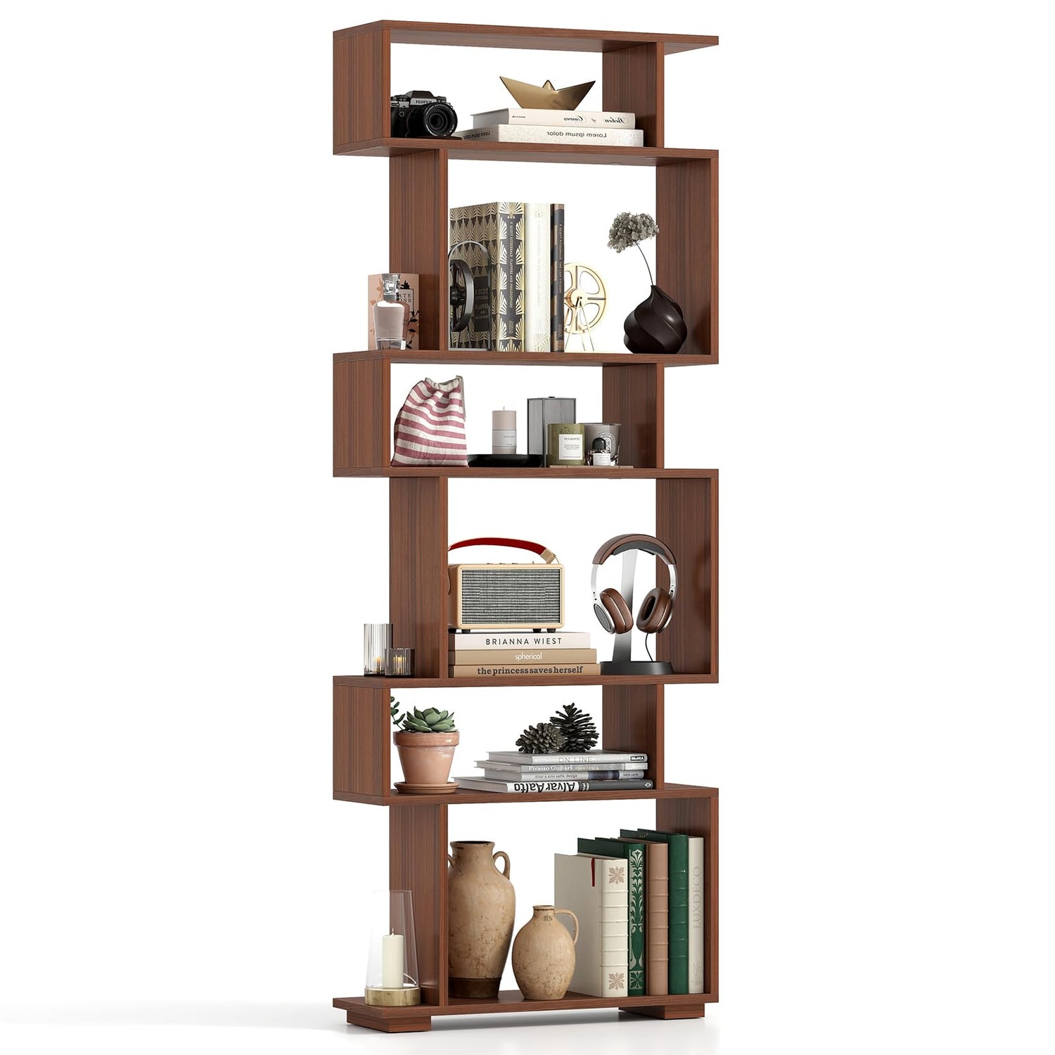 Tangkula 6-Tier S-Shaped Bookshelf, 64" Freestanding Geometric Bookcase, Home Office Wood Storage Shelf with Anti-Toppling Device, Room Divider Display Rack for Study, Living Room (1, Walnut)