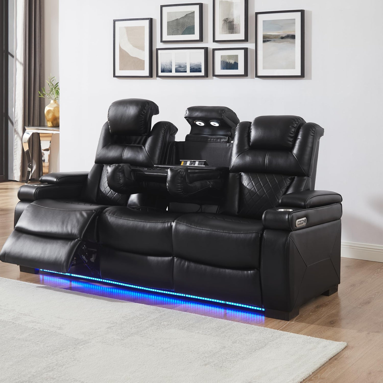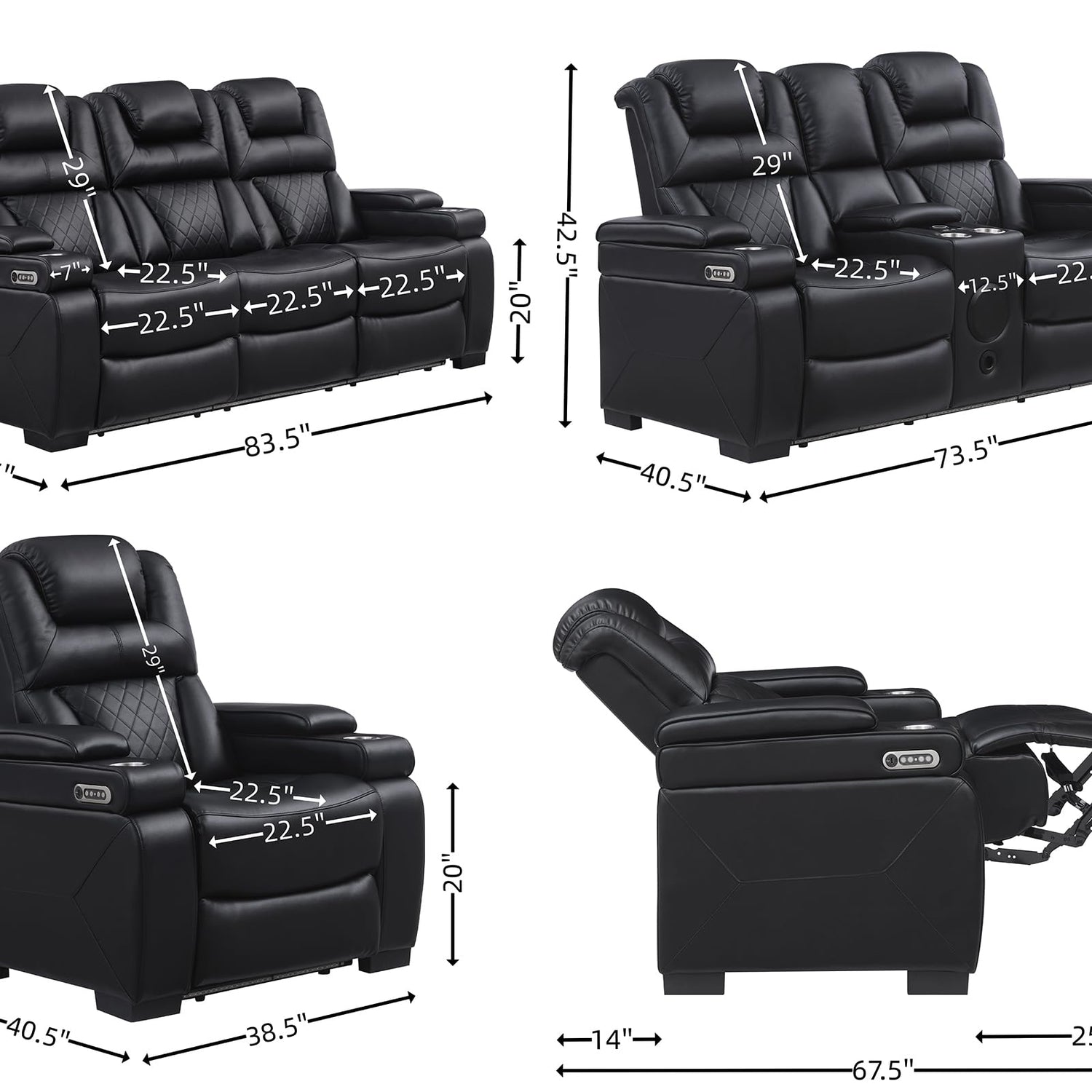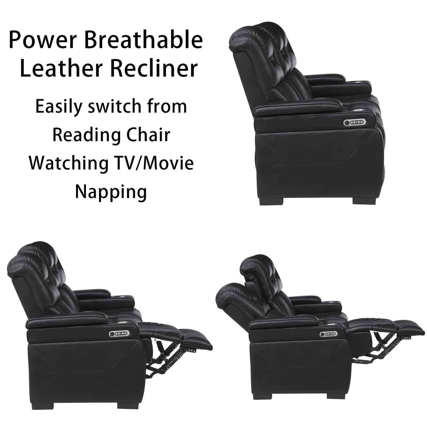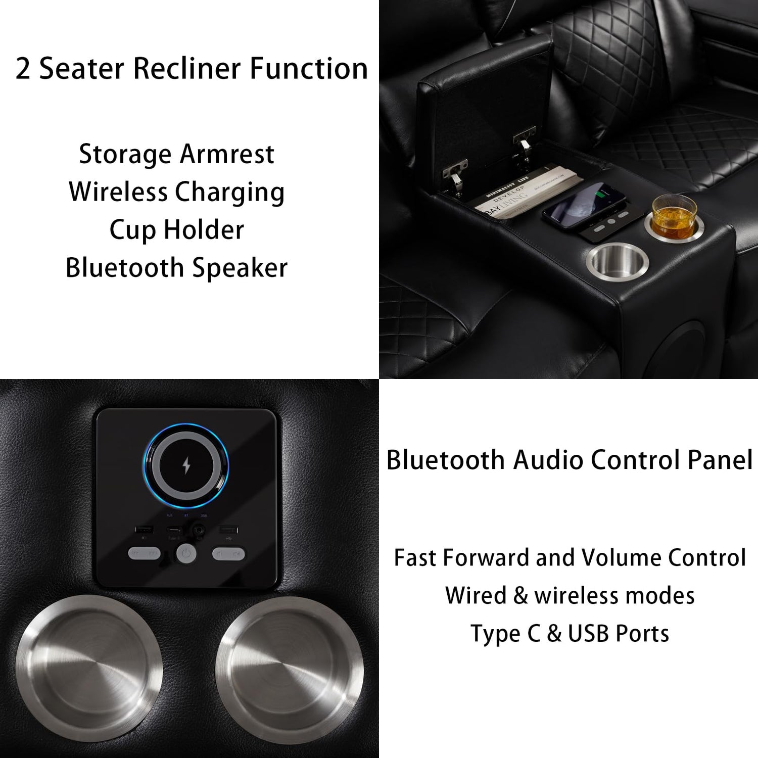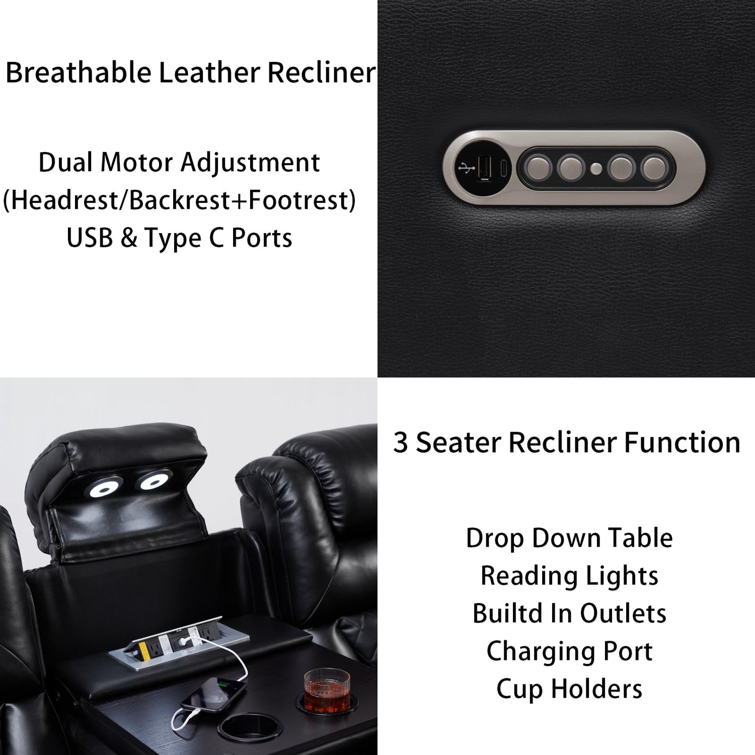 - 【Multi-functional Features】The 3-seater recliner sofa comes equipped with a reading light, USB charging port, cup holder, power outlets, and a unique drop-down table, ideal for holding books, drinks, or gadgets. The 2-seater recliner loveseat offers a wireless charger and Bluetooth speakers, allowing you to enjoy music while charging your devices. All models feature adjustable headrests, LED lighting, and storage arms, bring a new color palette and space storage to your living space