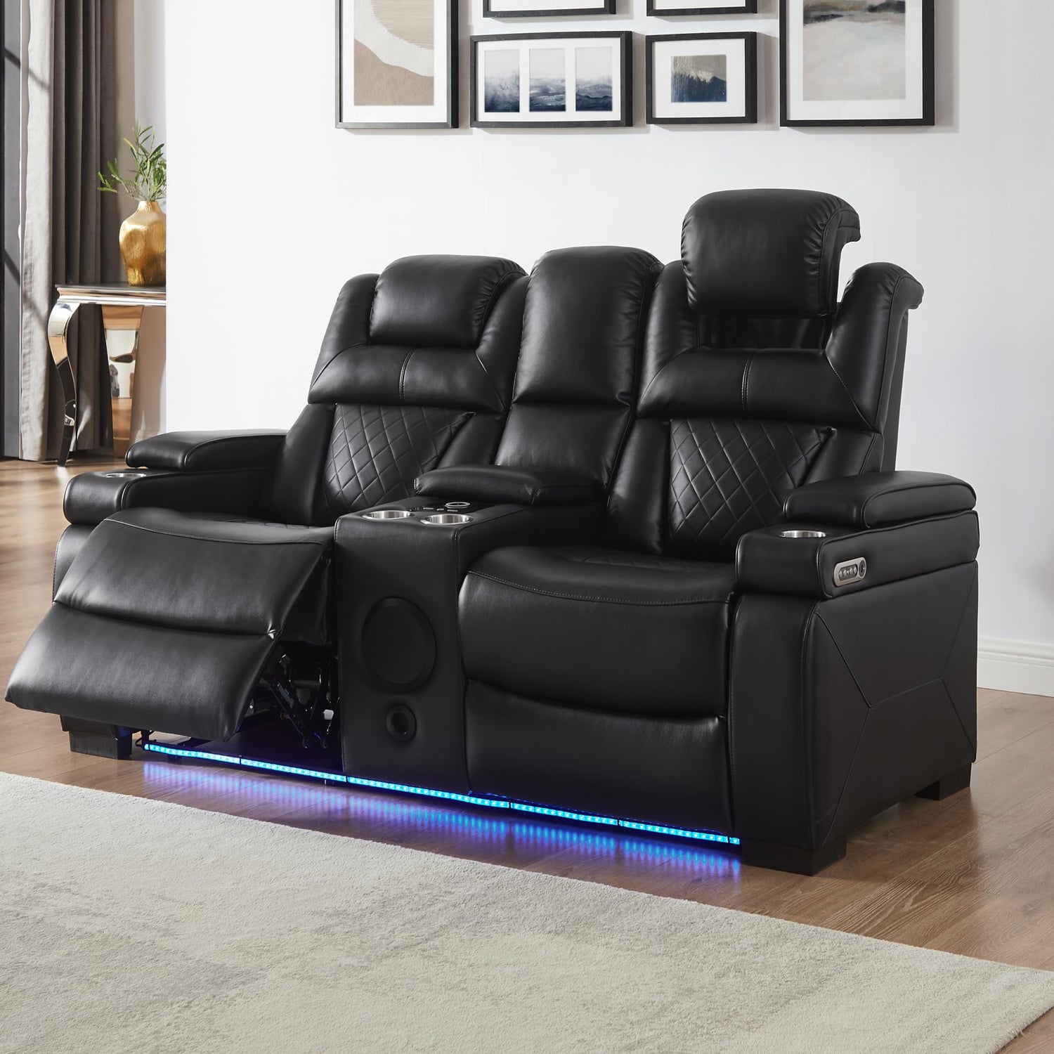 THSUPER Power Breathable Leather Reclining Sofa and Loveseat Set with LED Light, Home Theater Seating Recliner Couch with Adjustable Headrest/Reading Light/USB Port/Bluetooth Speaker, Black