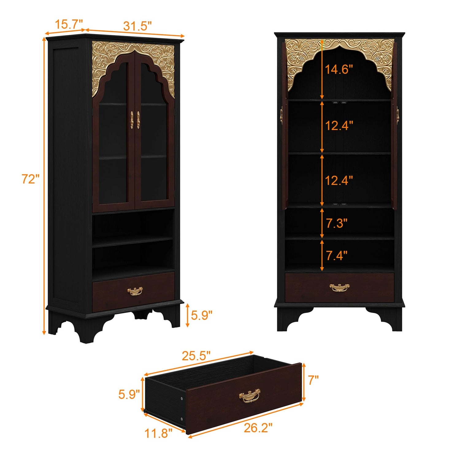 - Vintage Classic Design: This bookcase features a paneled design, with a classic black cabinet body complemented by reddish-brown drawers and door frames. Adorned with gilded patterns and vintage-style handles, it exudes an elegant and sophisticated presence. The glass cabinet doors offer both brightness and dust protection, balancing aesthetic appeal with practical functionality.