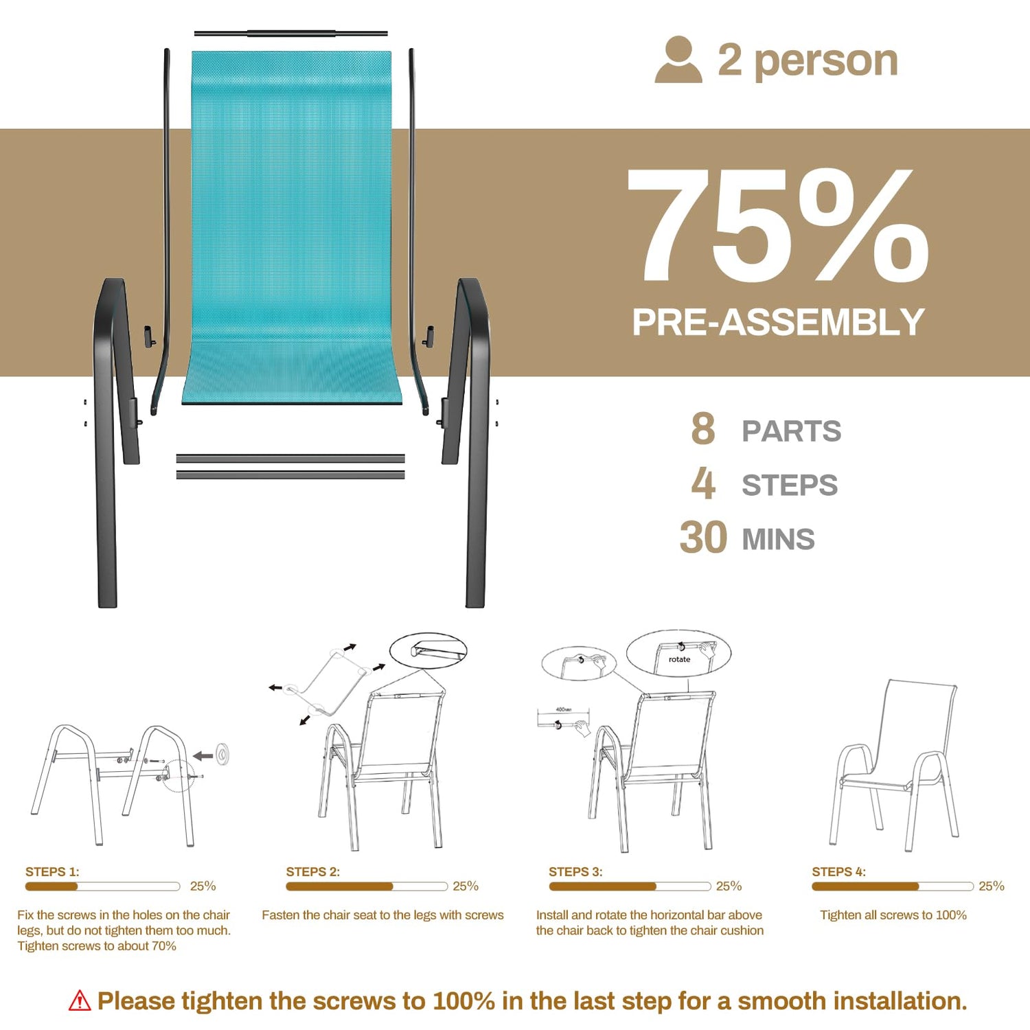 - INSTALLATION INSTRUCTION: Patio table and chair set has detailed assembly instructions. Patio chair requires two people. During installation, each screw should be tightened to 70%, two people worked together to pull the back fabric apart and align it with the steel frame, rotate rod on the back of chair to adjust length to appropriate position to tighten chair fabric, finally tighten all screws to 100%